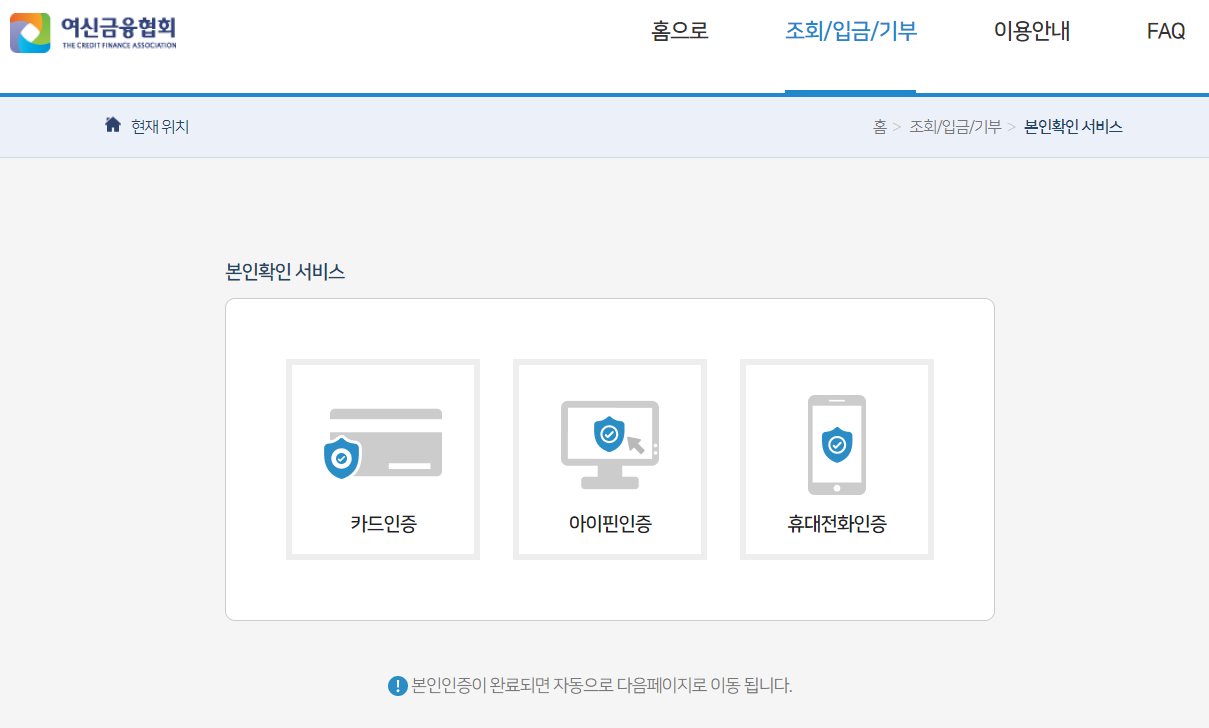 본인 확인 서비스로, 카드 / 아이핀 / 휴대전화 인증 중 한 가지 방법을 선택하셔서 진행하시면 됩니다