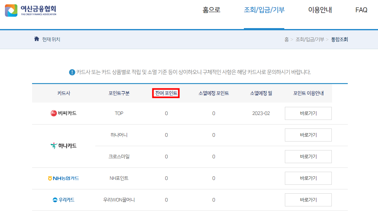 해당 페이지에서 각 카드사의 잔여 포인트 / 소멸 예정 포인트 / 소멸 예정 월 등 구체적인 확인이 가능합니다