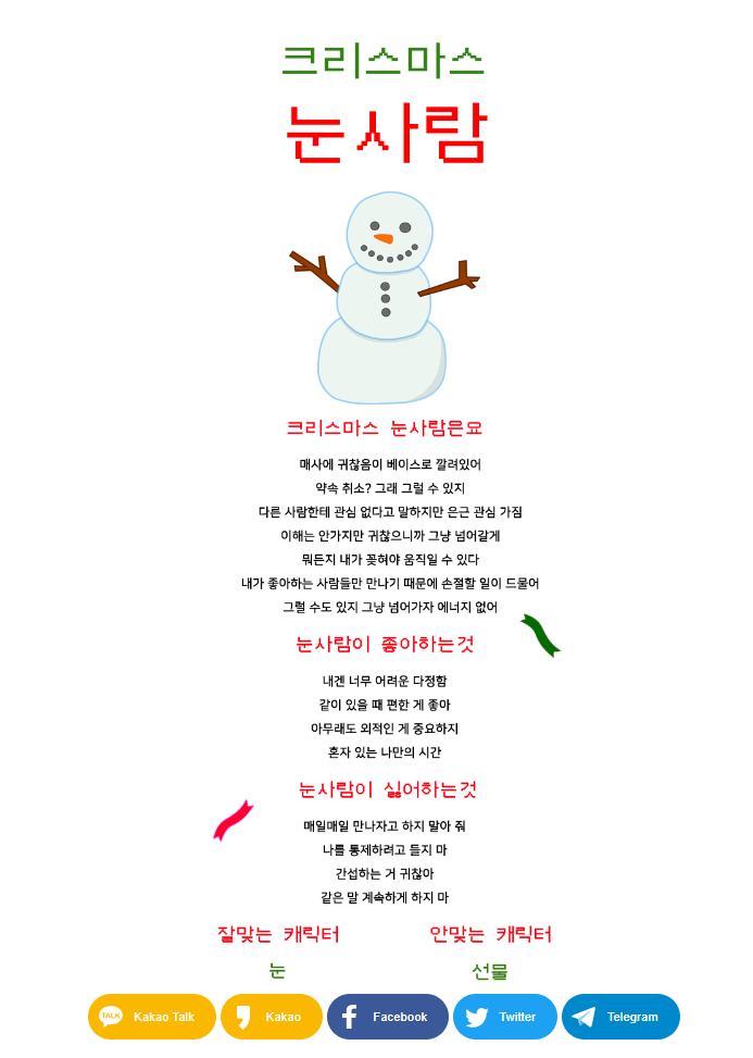 그리고 눈사람과 잘 맞는 캐릭터는 눈, 안 맞는 캐릭터는 선물이라고 해요!