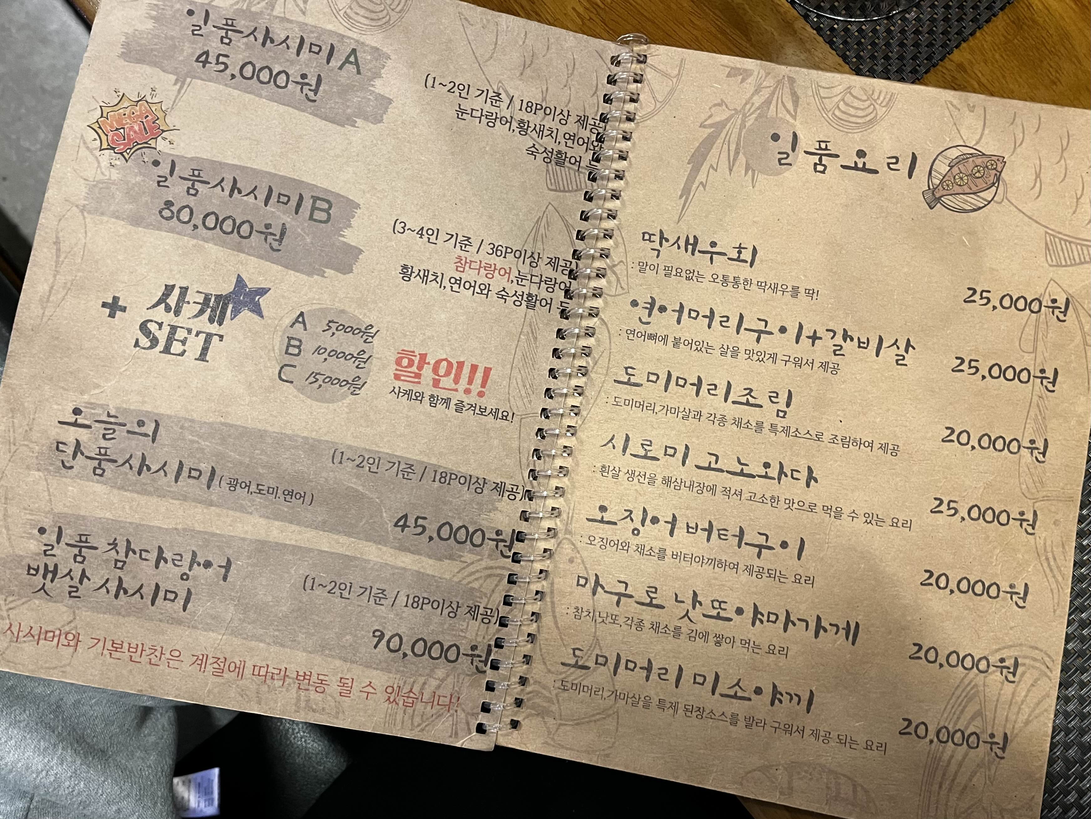 *제공되는 사시미와 기본 반찬은 계절에 따른 변동이 있을 수 있다는 점 참고해주세요!