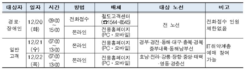 *장애인·경로 전화접수 예매는 1회 6매 총 12매, 결제기간 내 신분증 확인 후 역에서 발권