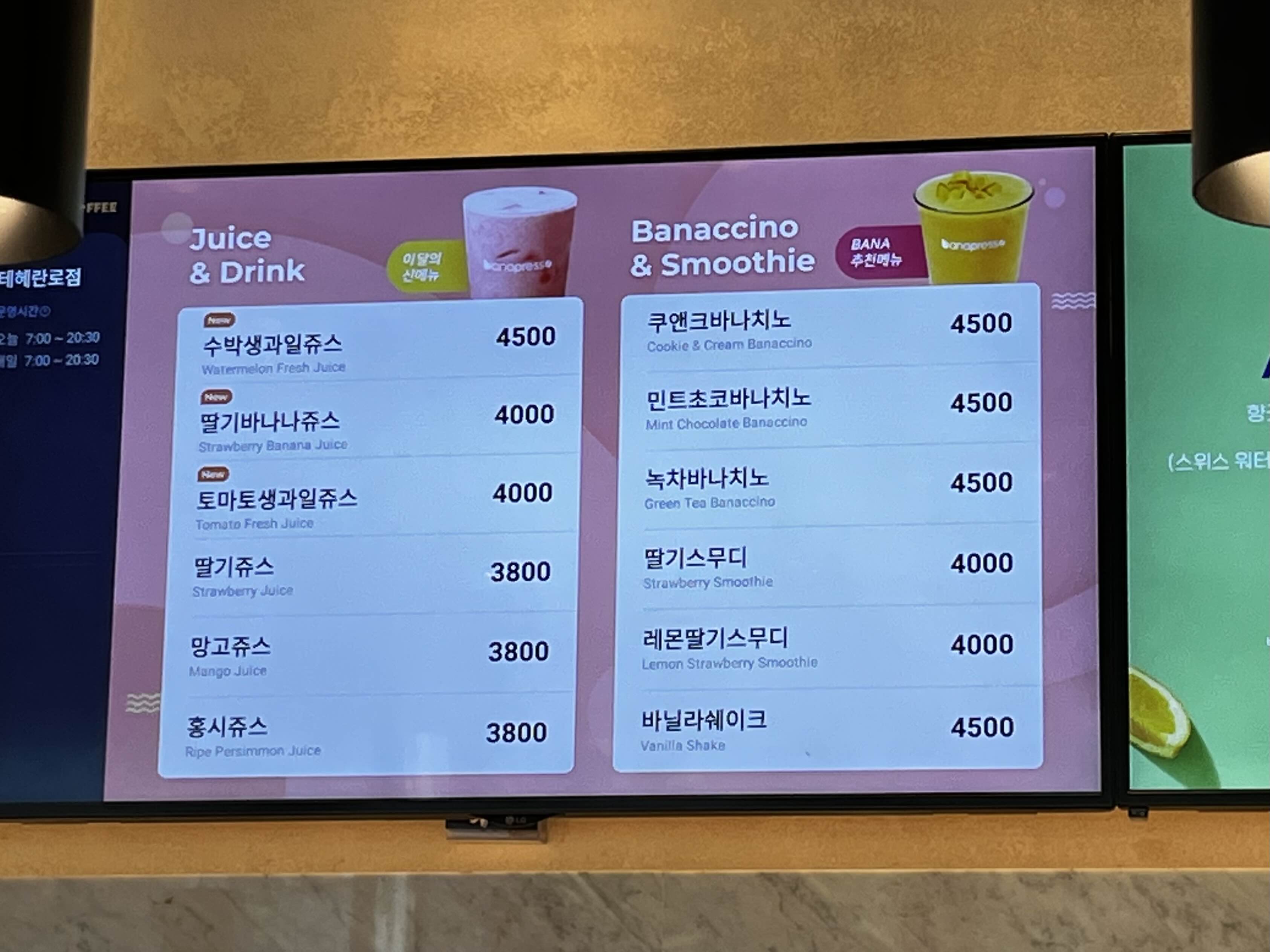여러 쥬스와 스무디 메뉴가 다양하게 준비되어 있는 바나프레소