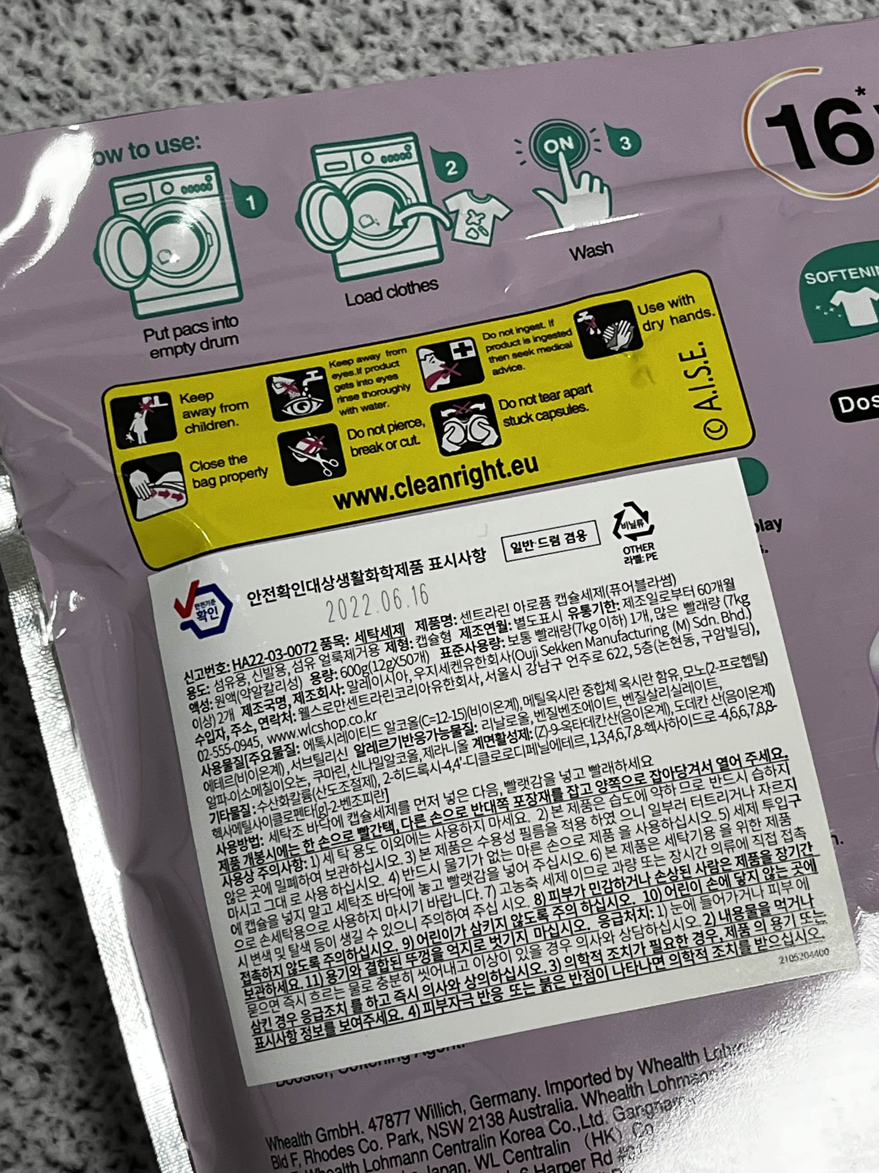 뒷면에는 아로퓸 캡슐세제의 정보와 간단한 세탁 방법이 쓰여있어요