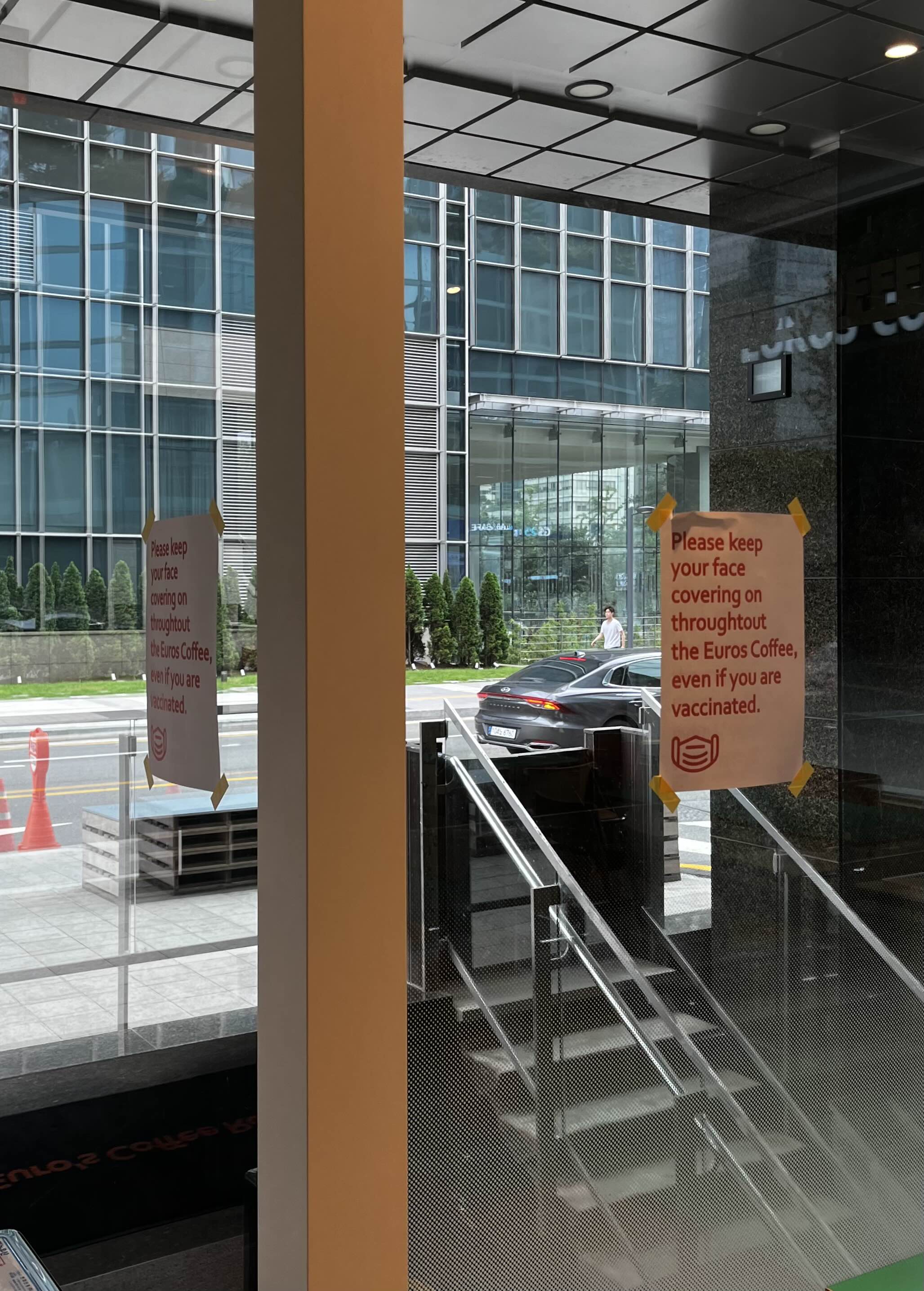 입구 쪽 창쪽에 마스크를 착용해달라는 안내 문구와