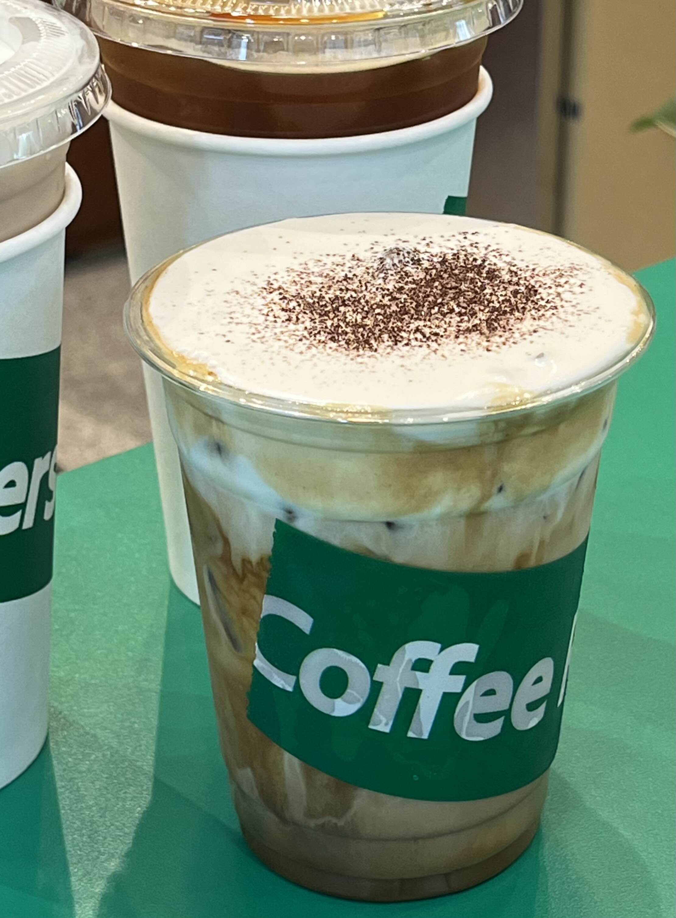 초록색 네임 테이프가 둘러진 테이크아웃용 컵들 🤍