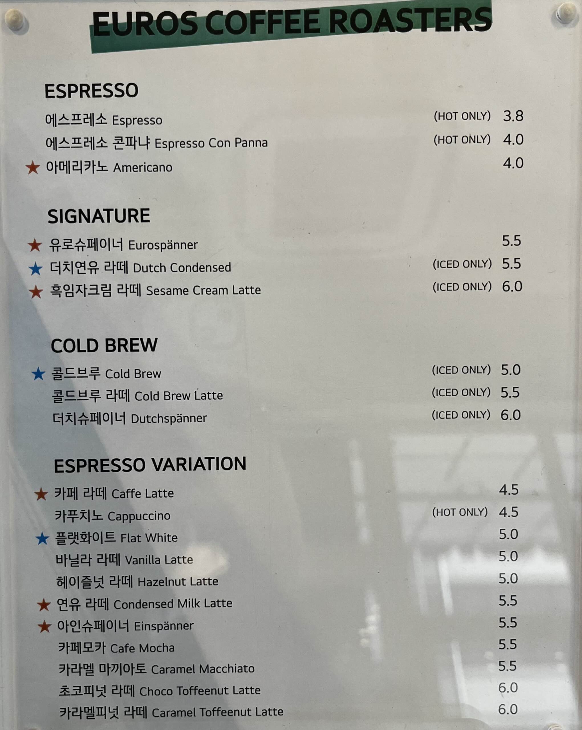 카운터 앞에 비치된 유로스커피의 전체 메뉴 모습입니다