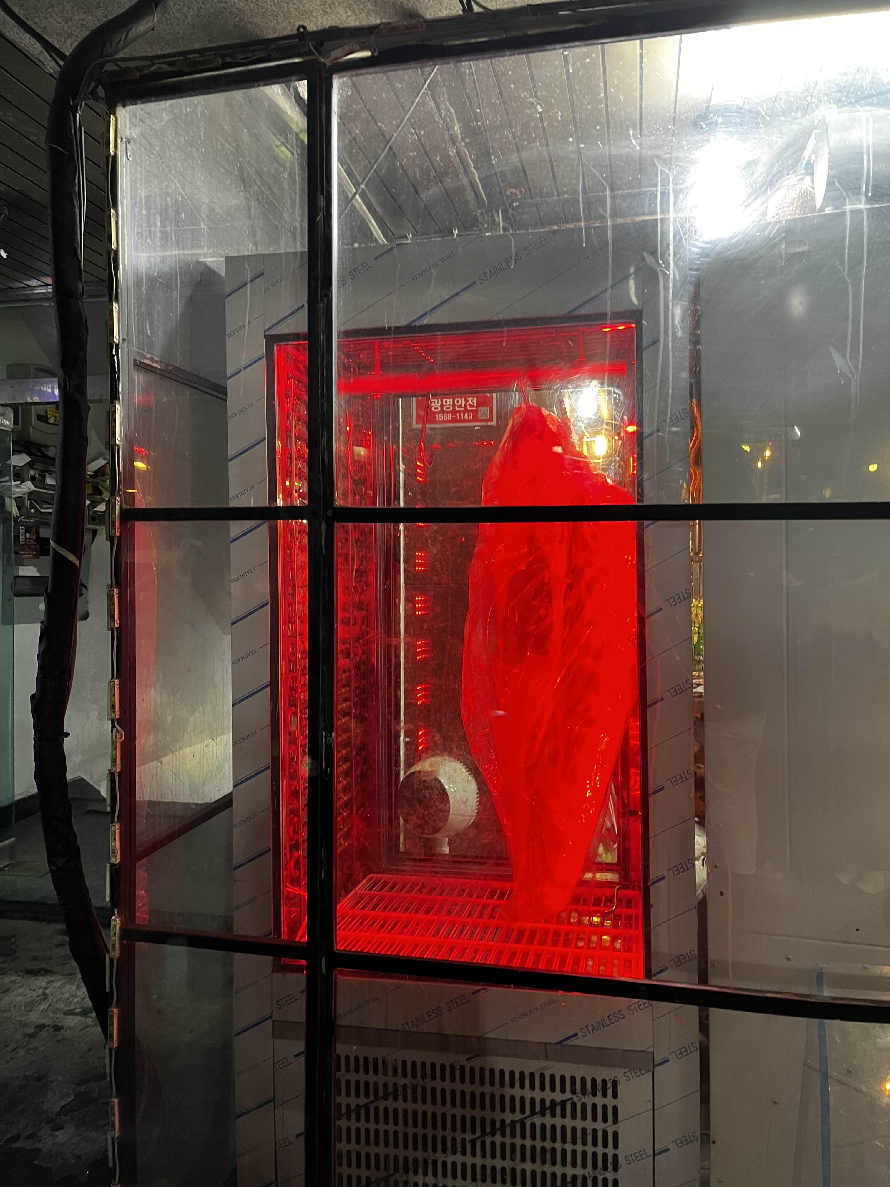 빨간 불빛 숙성실에 커다란 고기가 통으로 걸려있는 모습