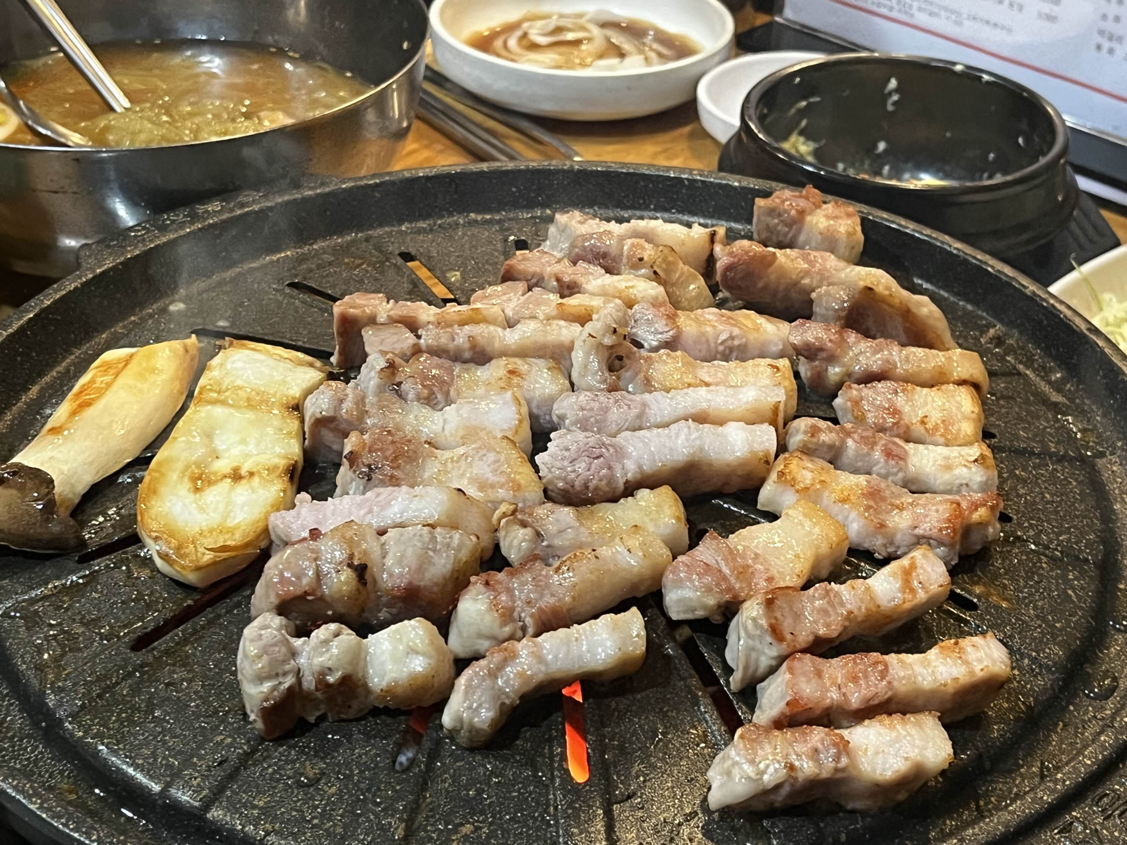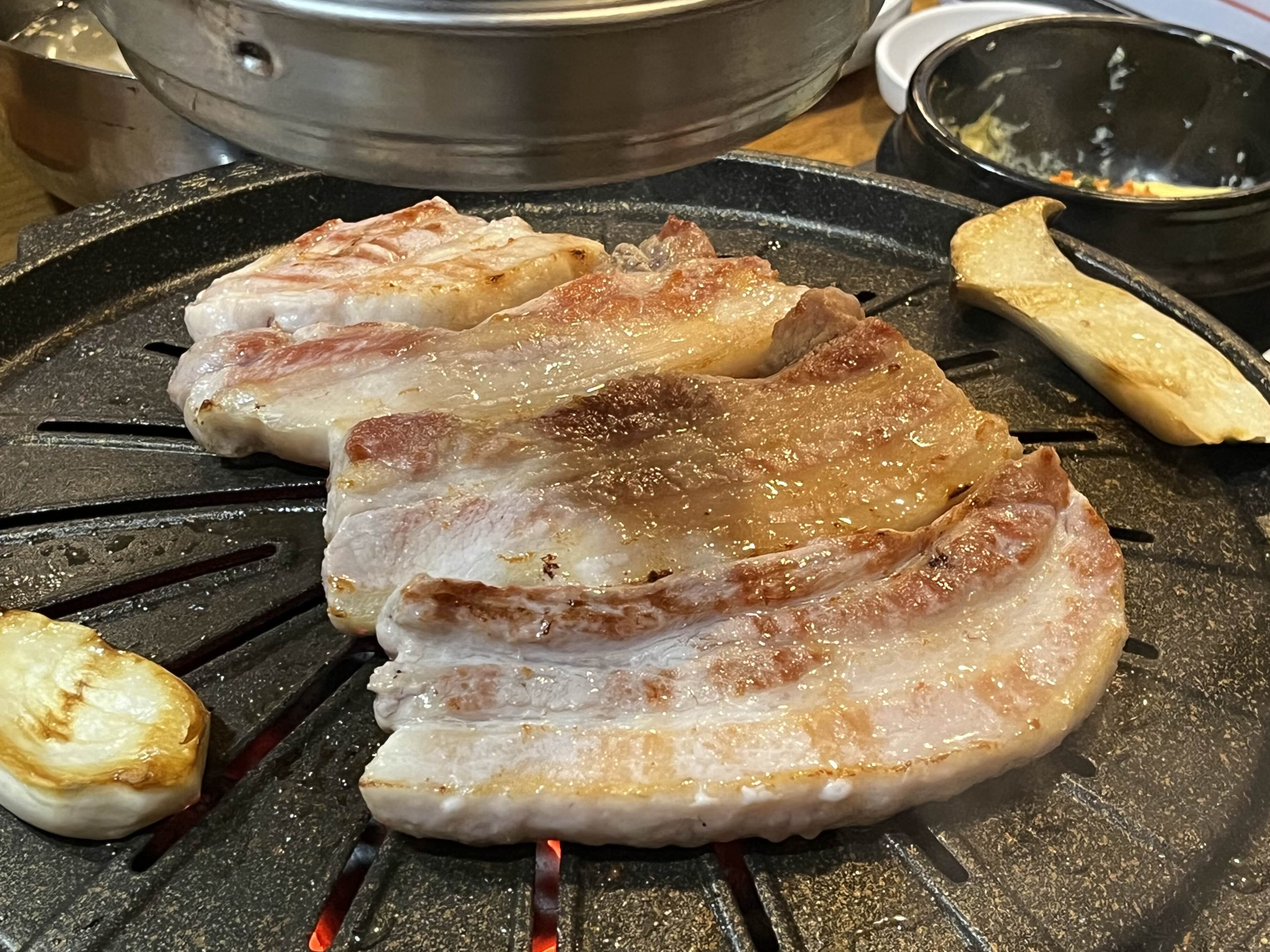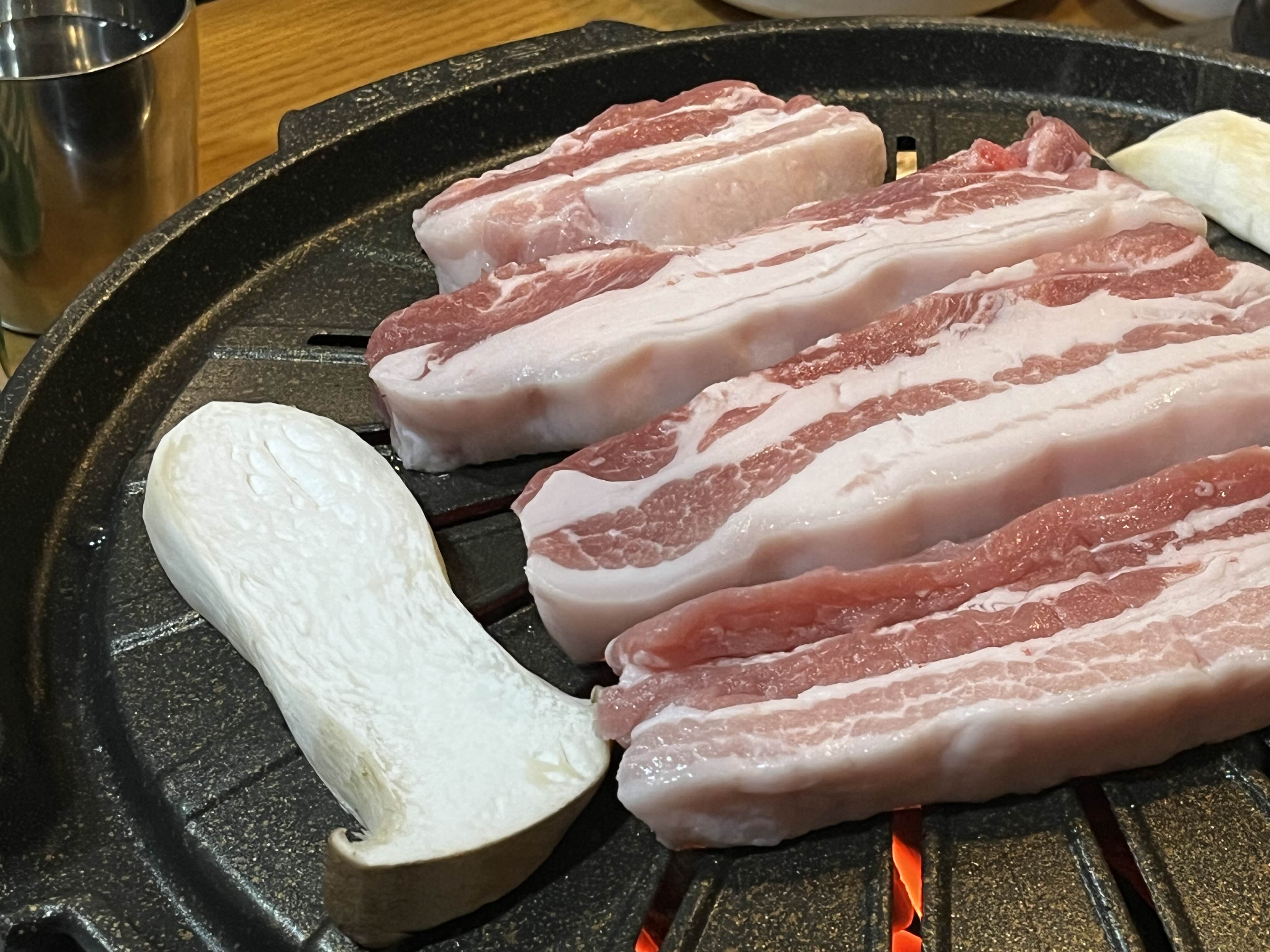 삼겹살을 올린 불판과 다르게 세팅된 판에 올려주고 맛있게 구워줍니다🤤