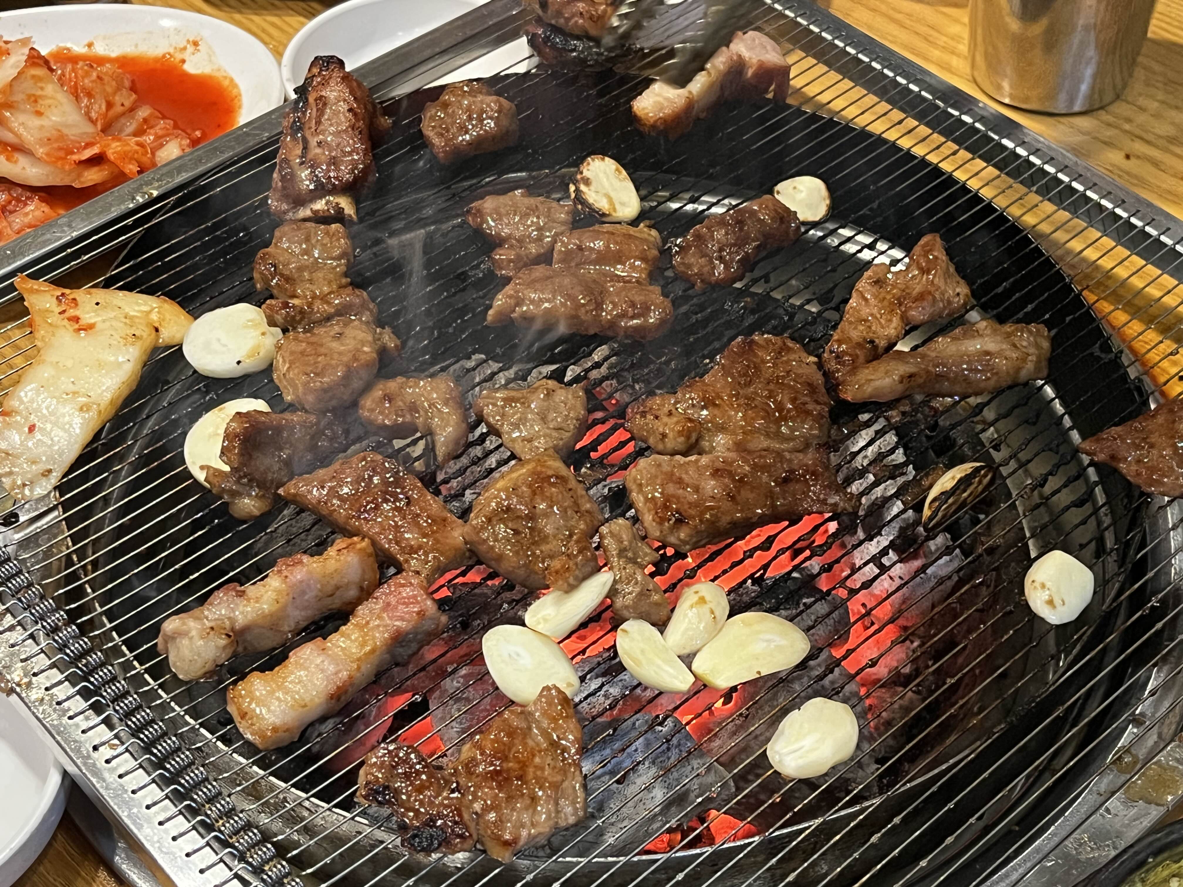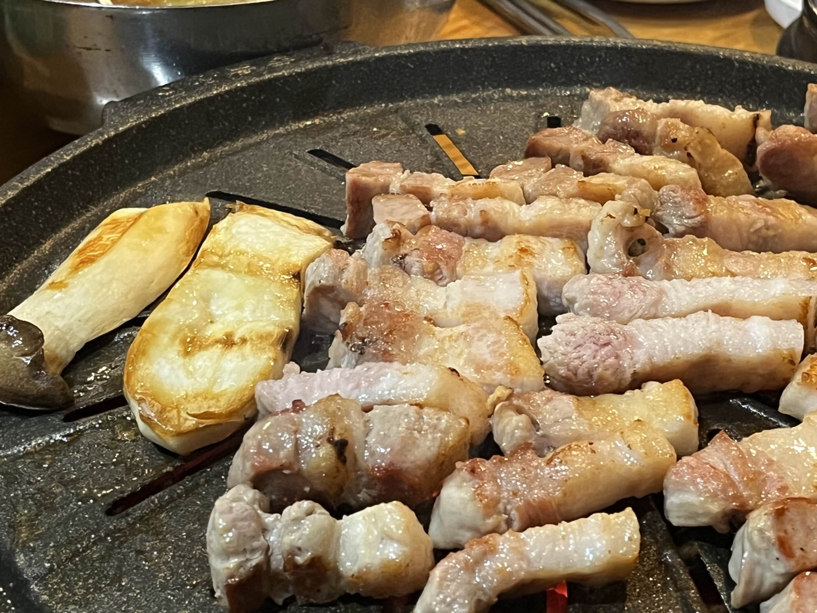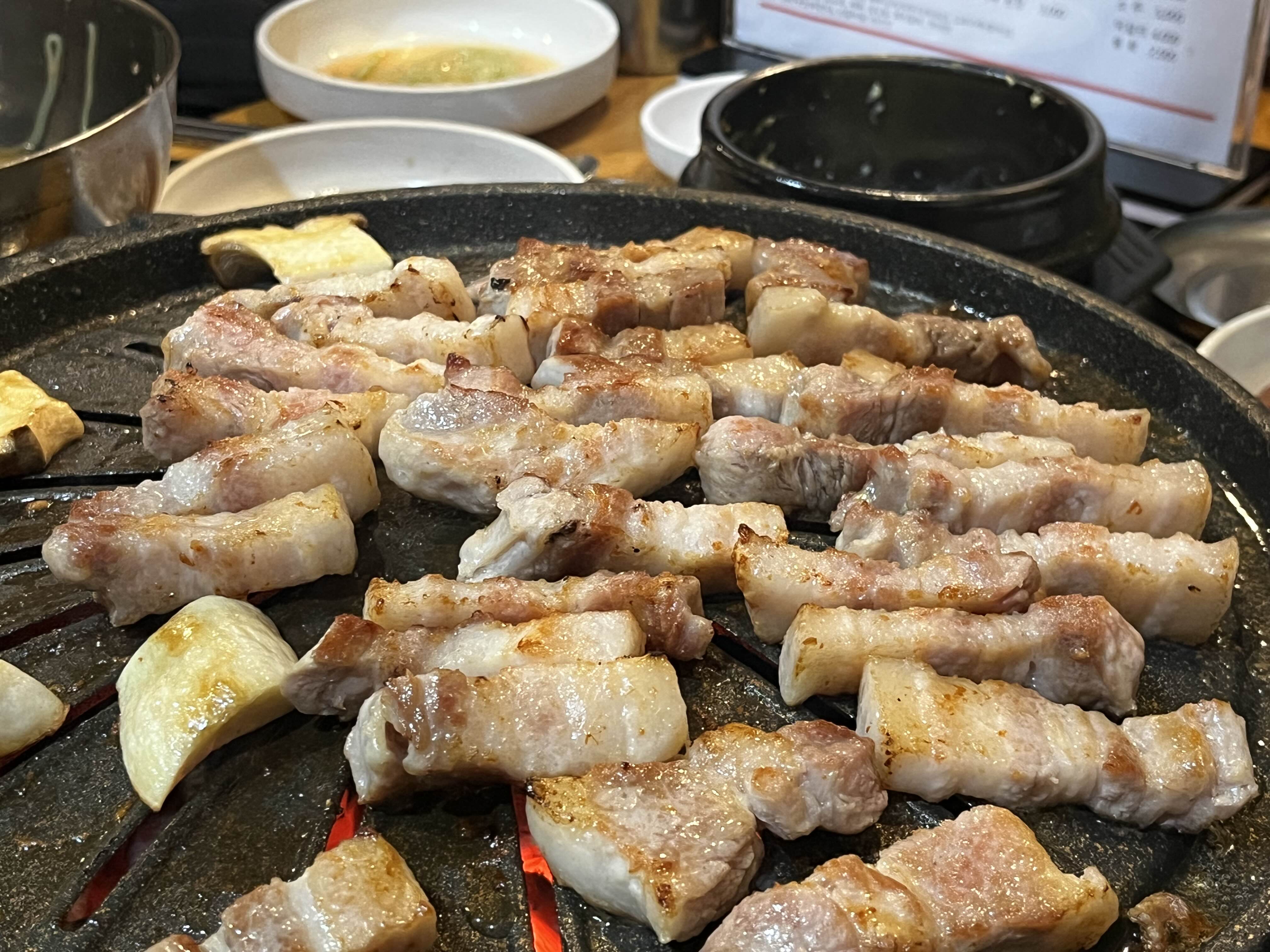삼겹살을 올린 불판과 다르게 세팅된 판에 올려주고 맛있게 구워줍니다🤤