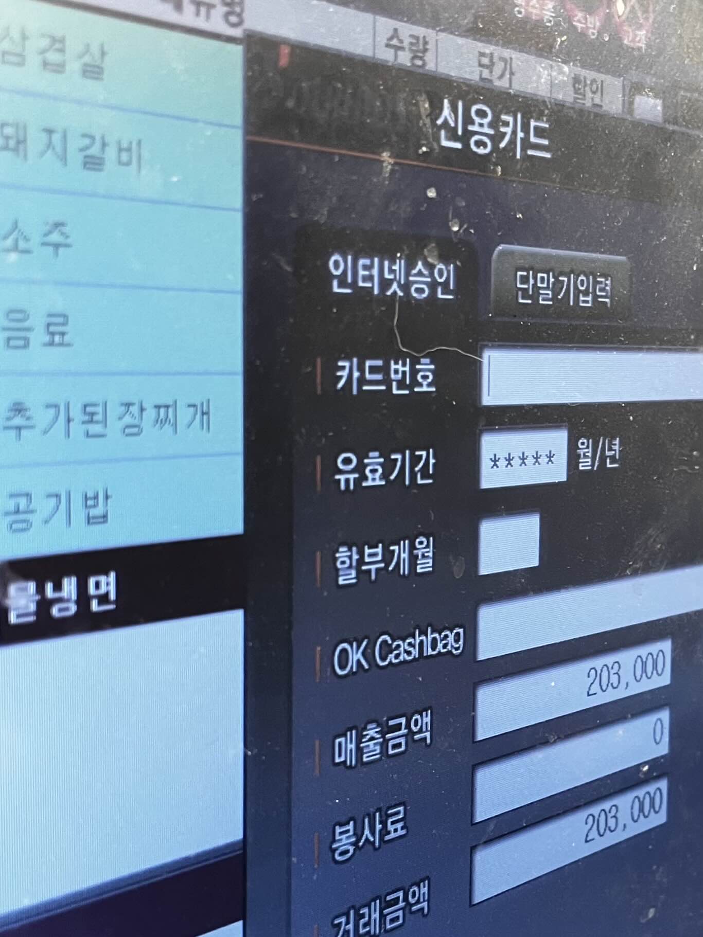 식사류로는 순댓국 / 순대만 순댓국 / 돼지국밥 / 오소리국밥 / 섞어 국밥 / 직화 제육볶음 등
