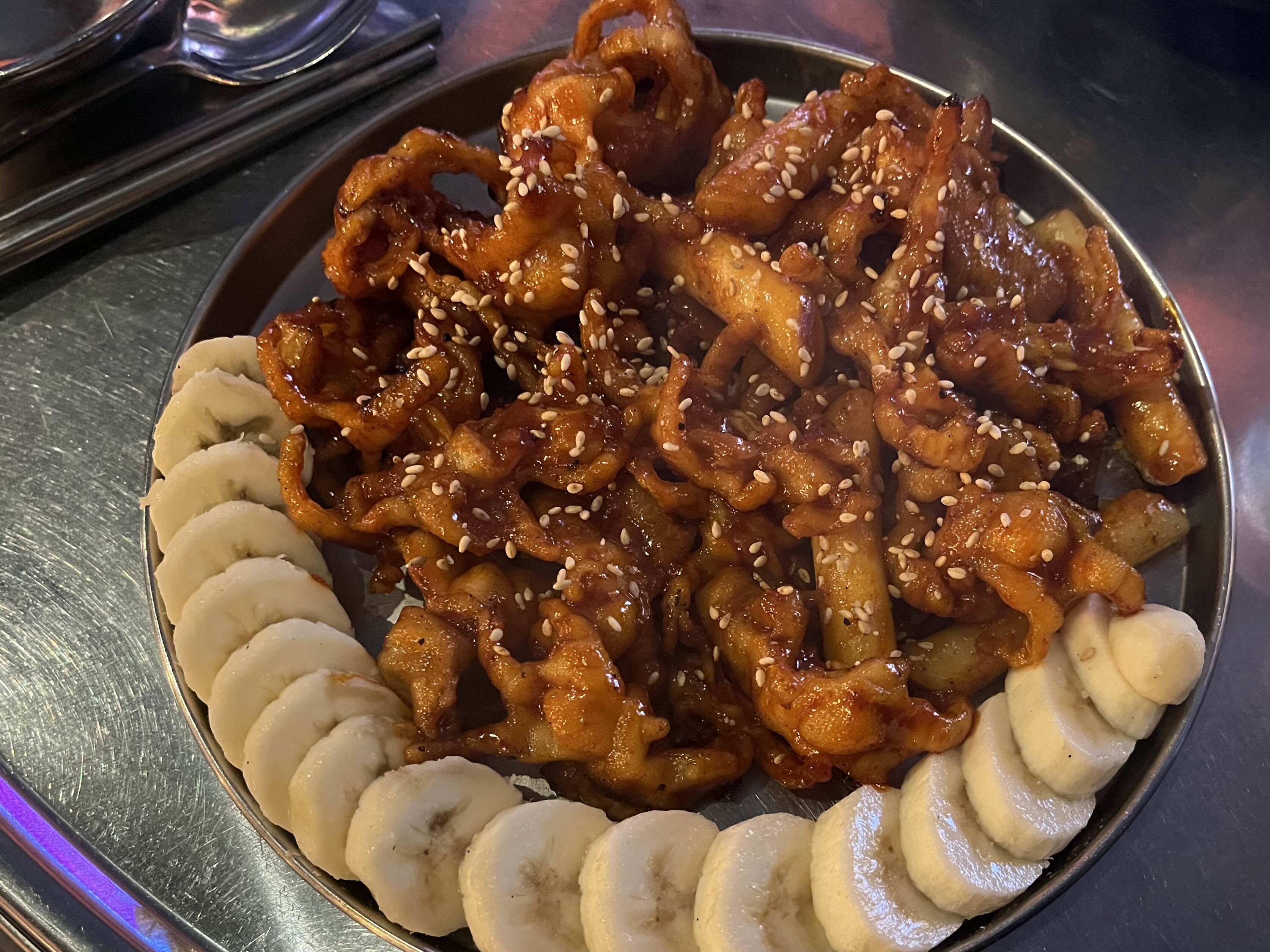 저는 그중에서 무뼈 닭발을 선택했고, 사이드로 바나나가 함께 나오는 독특한 조합입니다🍌