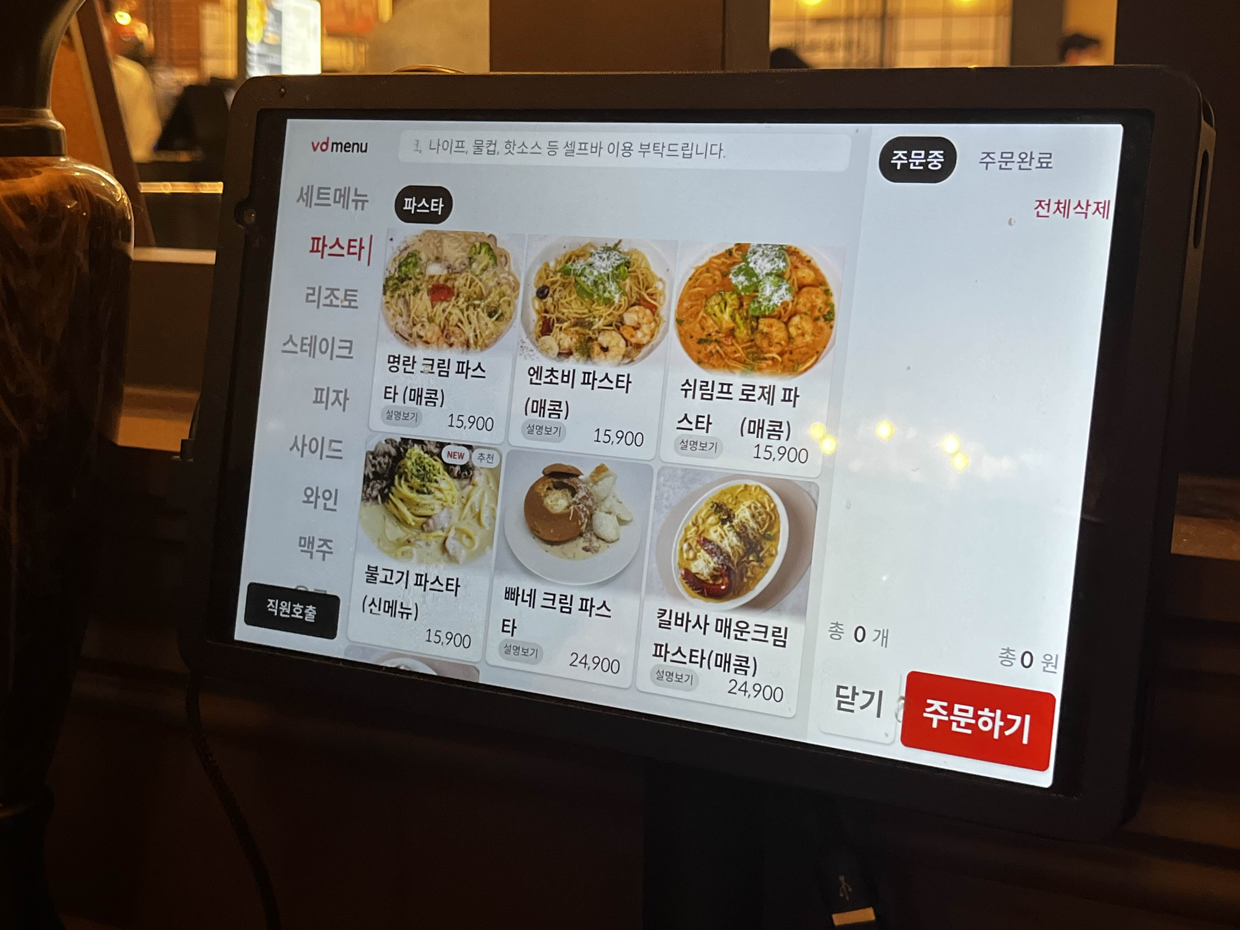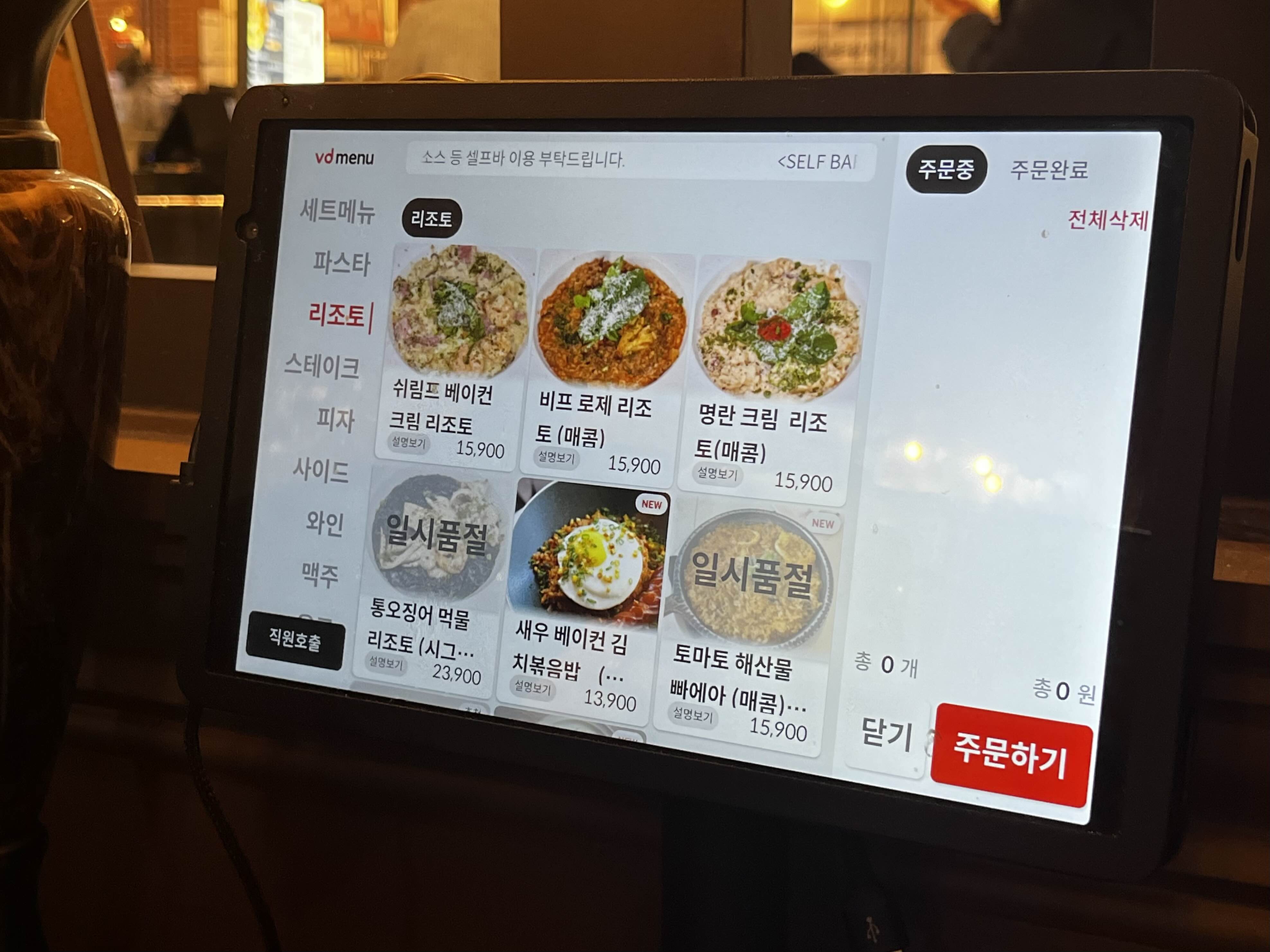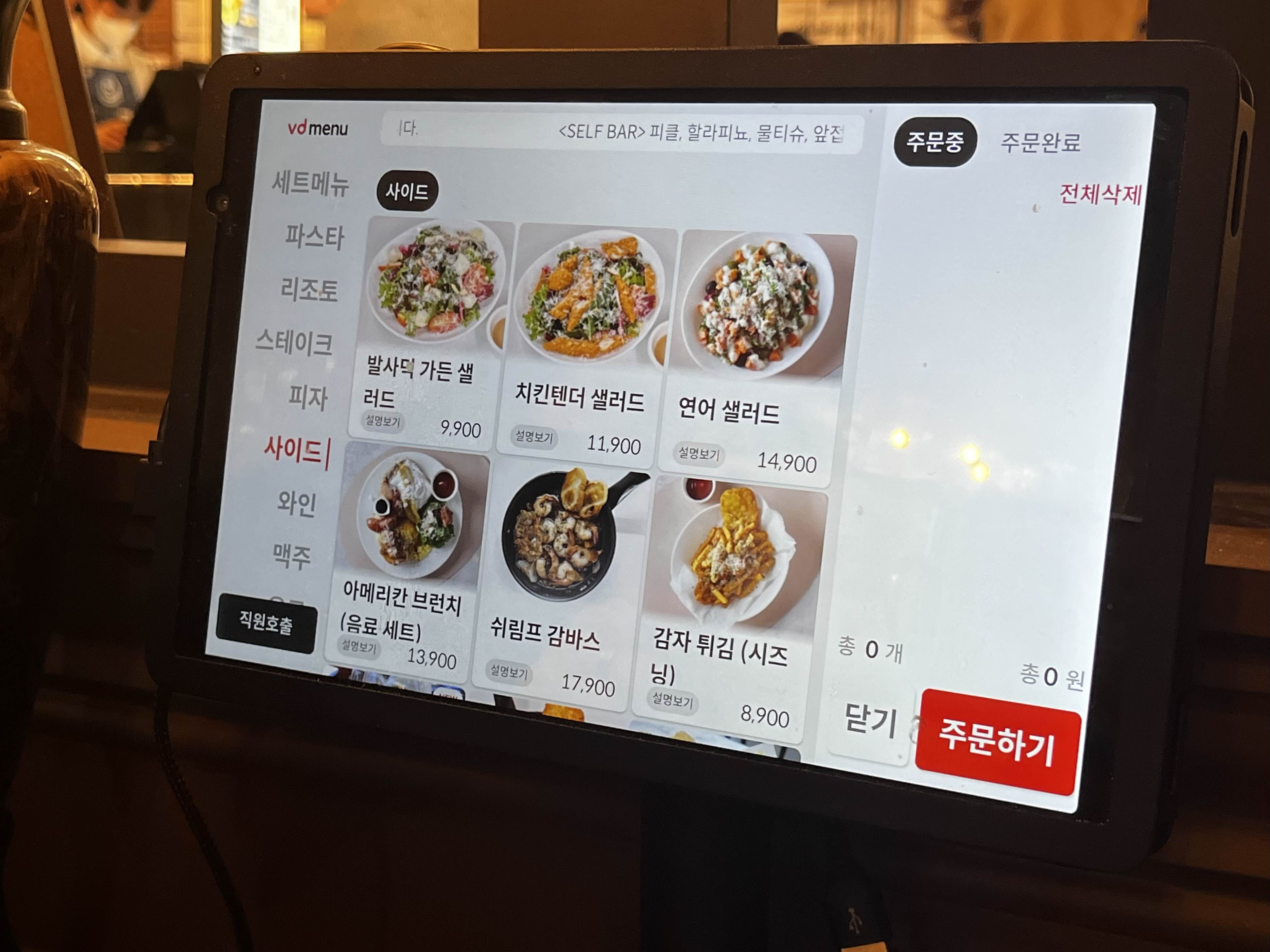 이태리 키친의 모든 주문은 각 자리에 배치된 태블릿을 통해 가능해요