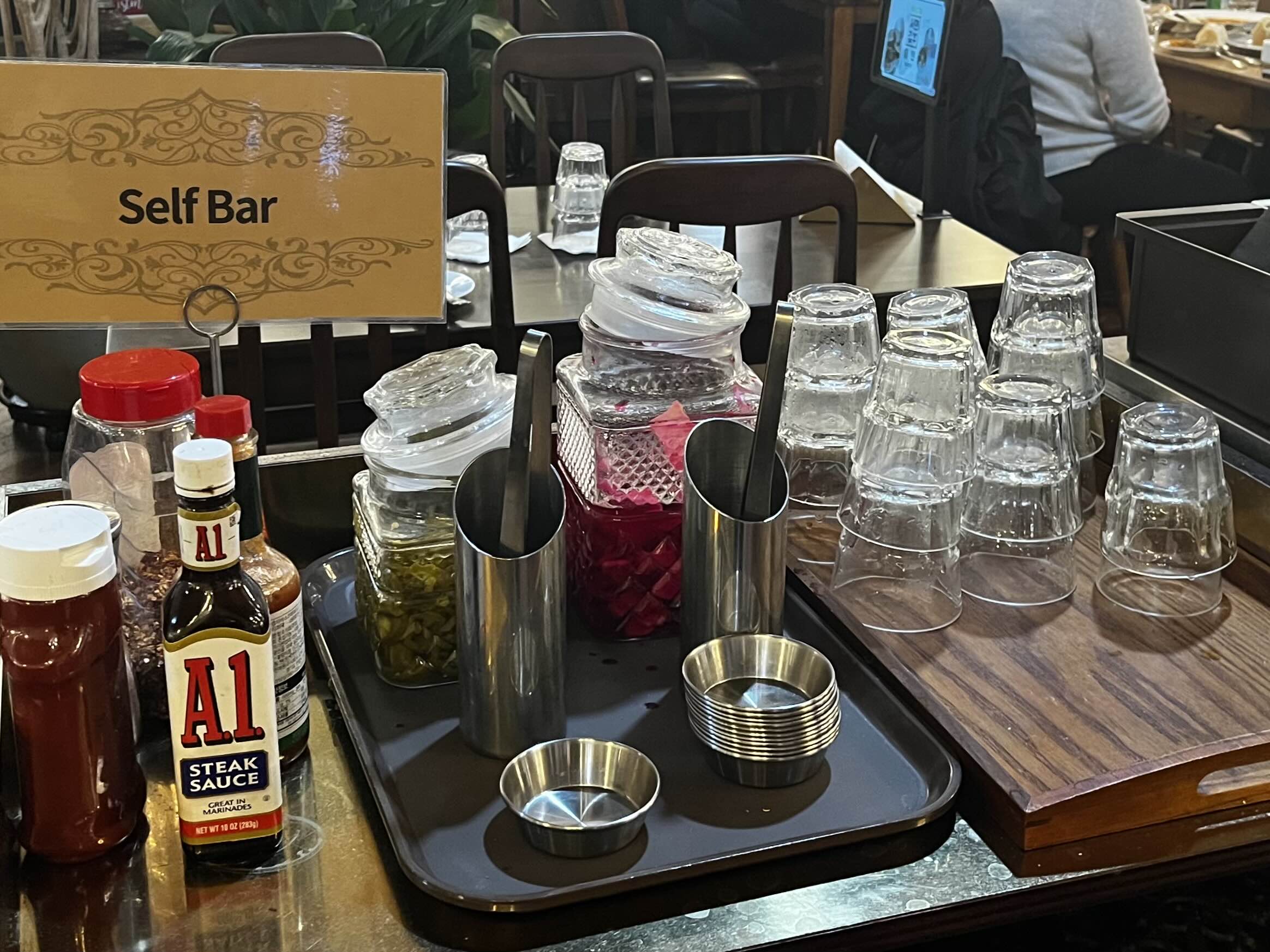 카운터 앞쪽엔 식사에 필요한 여러 소스, 피클, 컵 등 셀프로 가져다 이용하실 수 있는 바가 있어요🍴