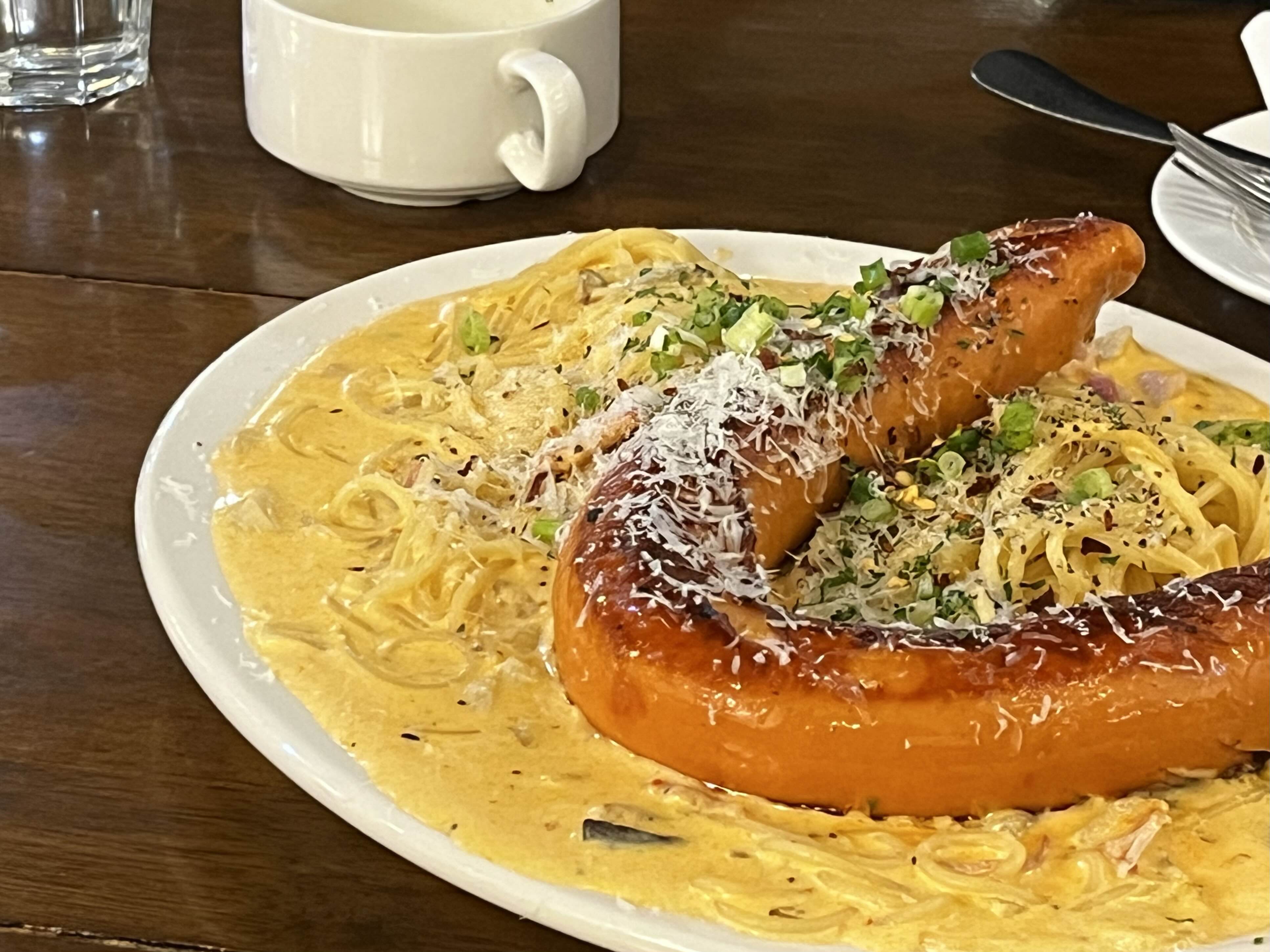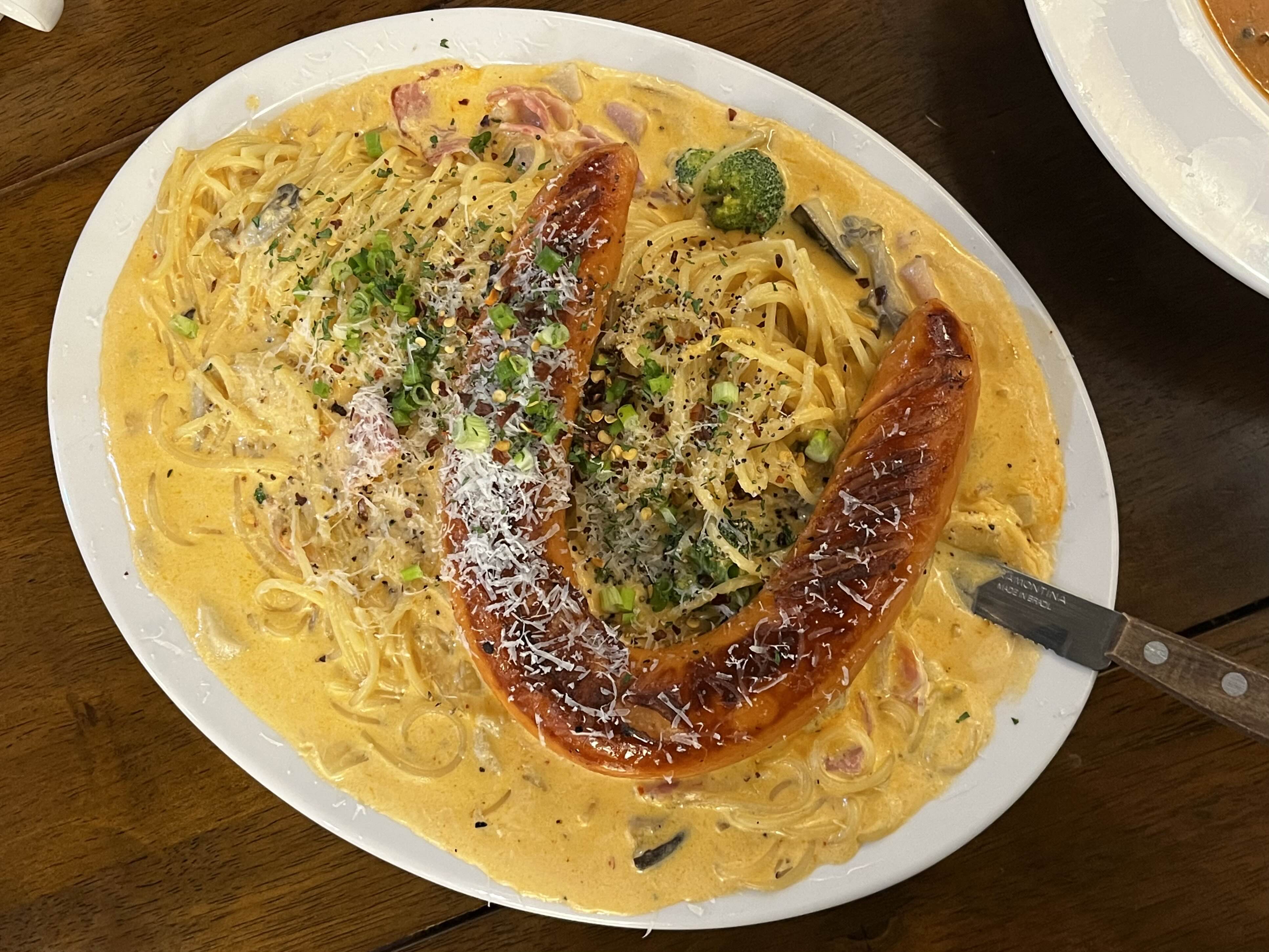 톡톡 터지는 훈연 소시지 킬바사의 식감도 파스타랑 잘 어울려서 너무 맛있었습니다