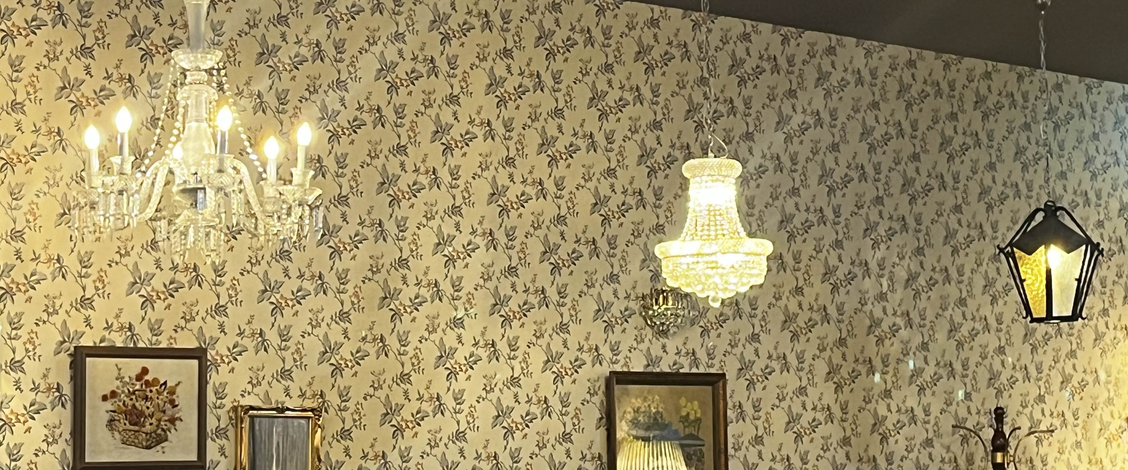 화려한 꽃무늬 벽지와 다양한 장식들, 그리고 모두 다르게 생긴 조명 인테리어