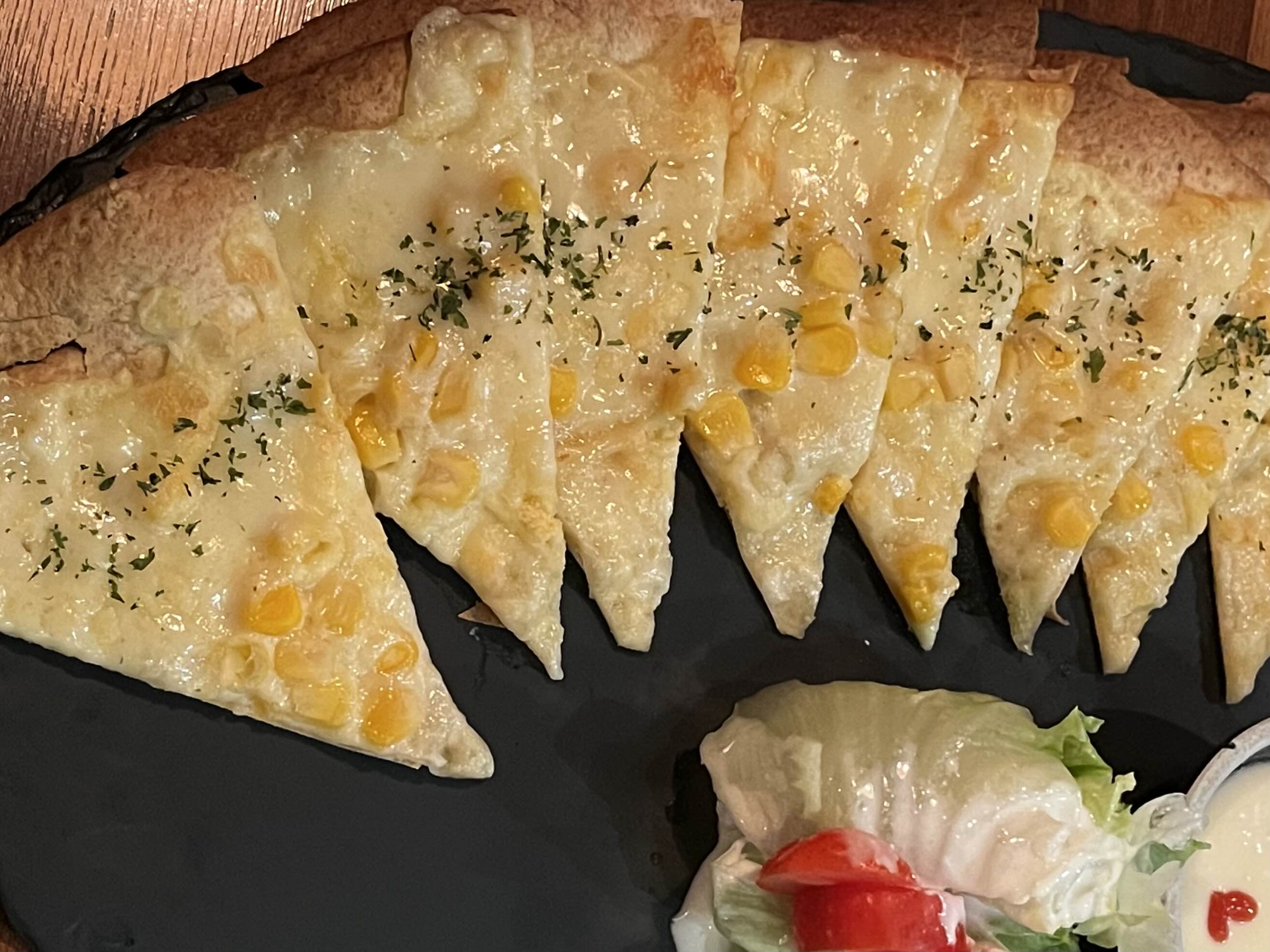 또띠아 위에 콘 치즈가 올라간 옥수수 피자와 샐러드
