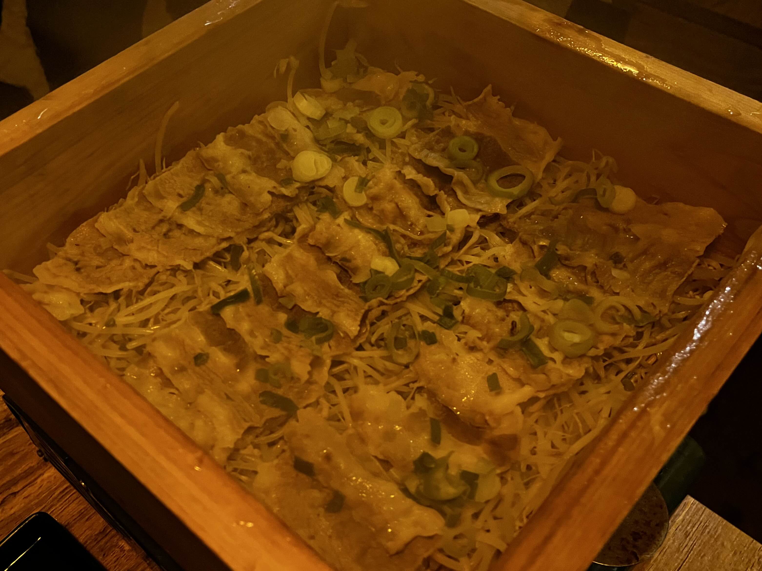 첫 번째 단에는 얇게 썰린 소고기와 고기 아래 숙주나물이 두껍게 깔려있어요🥓