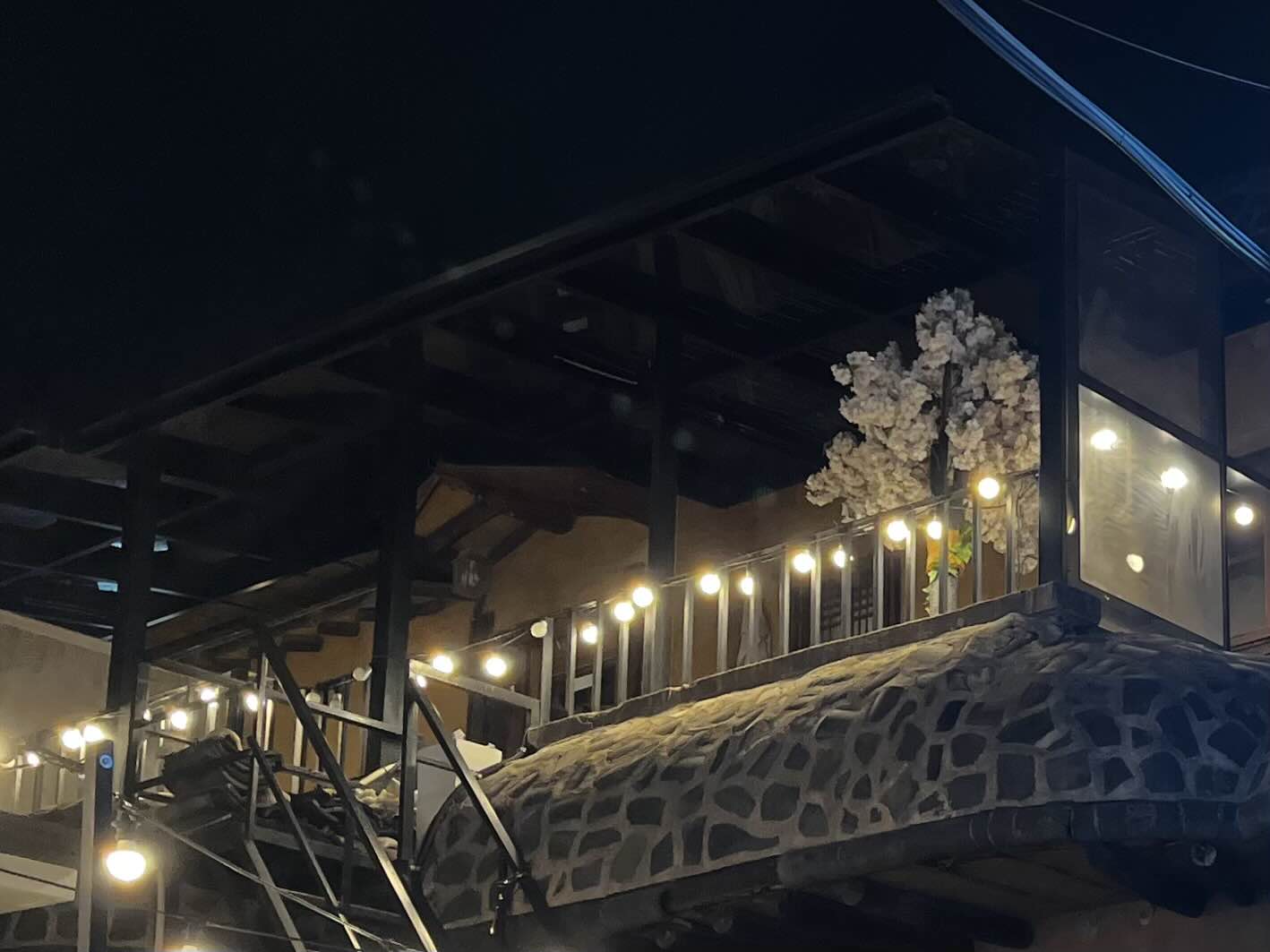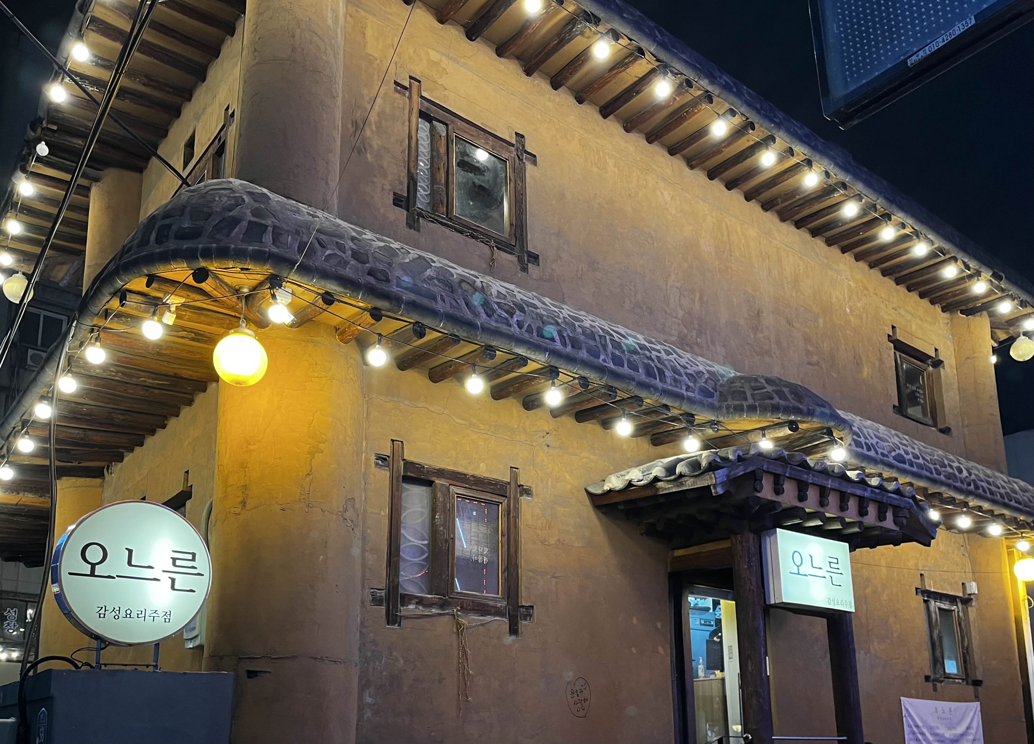 특히, 지붕밑에 매달려있는 동그라미 전구들이 건물의 따뜻한 분위기와 잘 어울리는 것 같아요