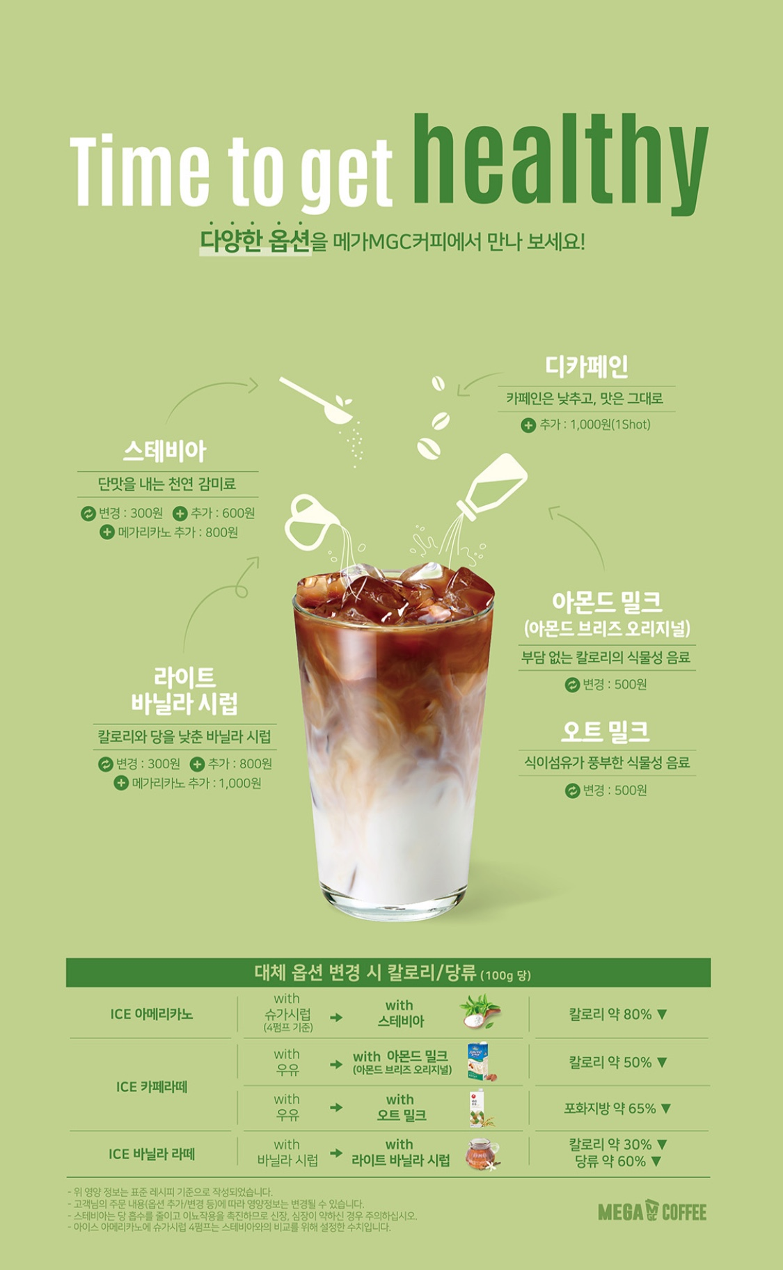 슈가시럽을 스테비아로 변경 가능한 메가커피의 퍼스널 옵션에 대한 안내입니다(*스테비아 별도 추가 가능)