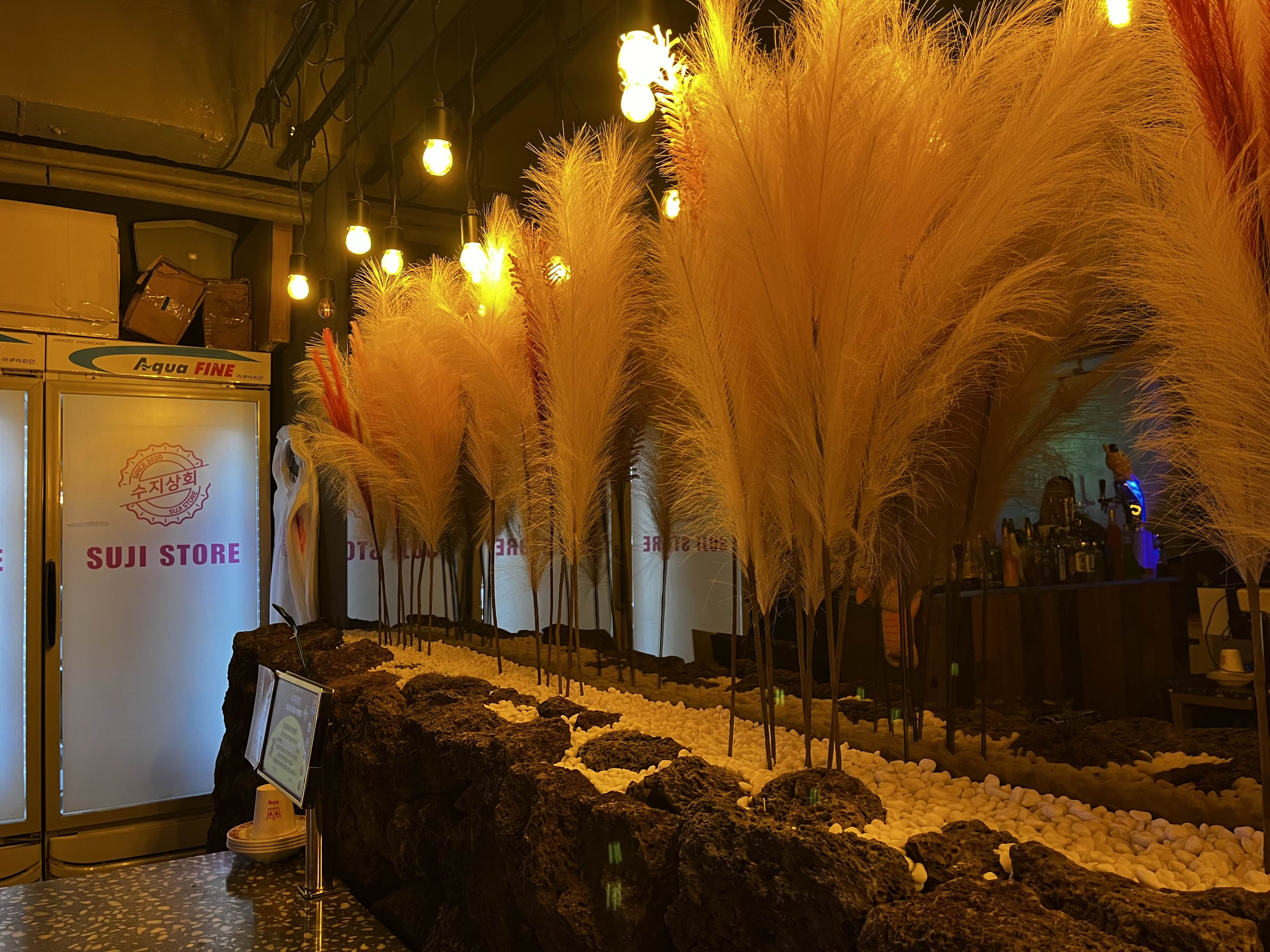 핑크뮬리 느낌의 갈대 소품으로 장식되었는데 독특하고 예쁜 인테리어라는 생각이 들었습니다