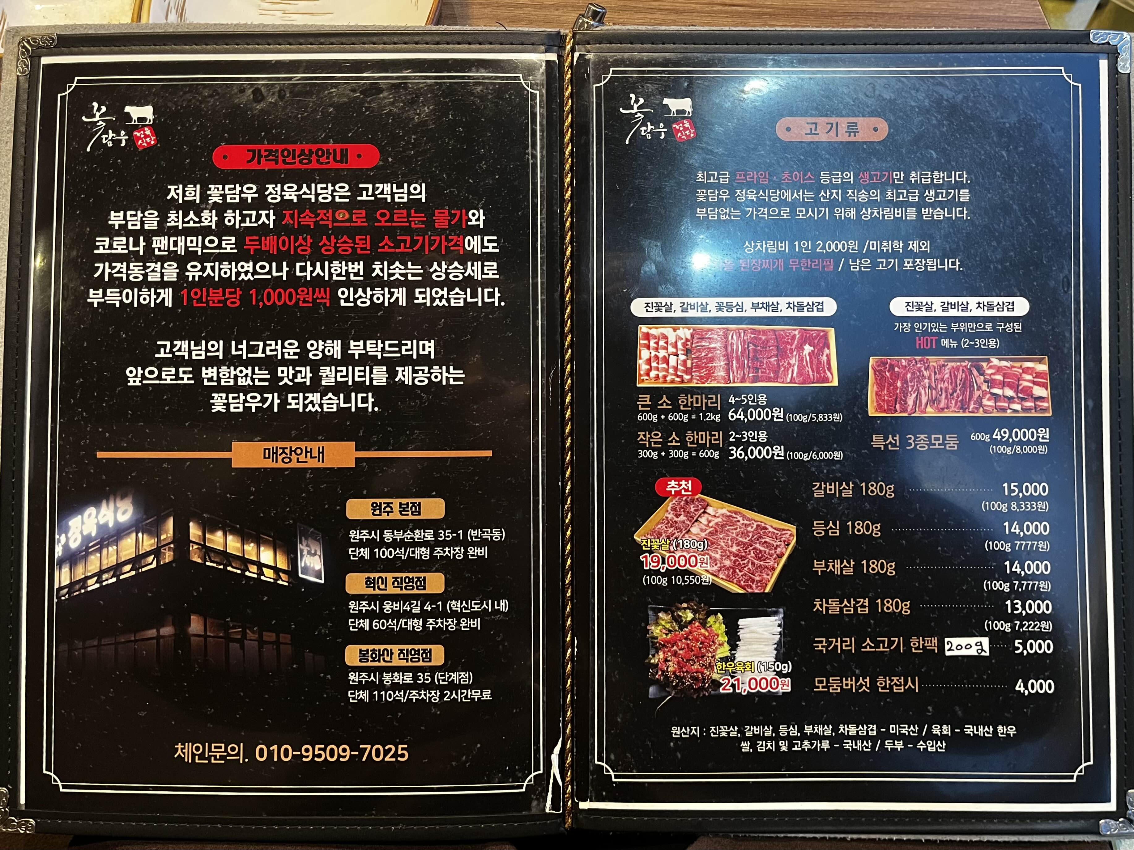 꽃담우 정육식당은 원주에서 총 네 지점으로 운영되고 있습니다