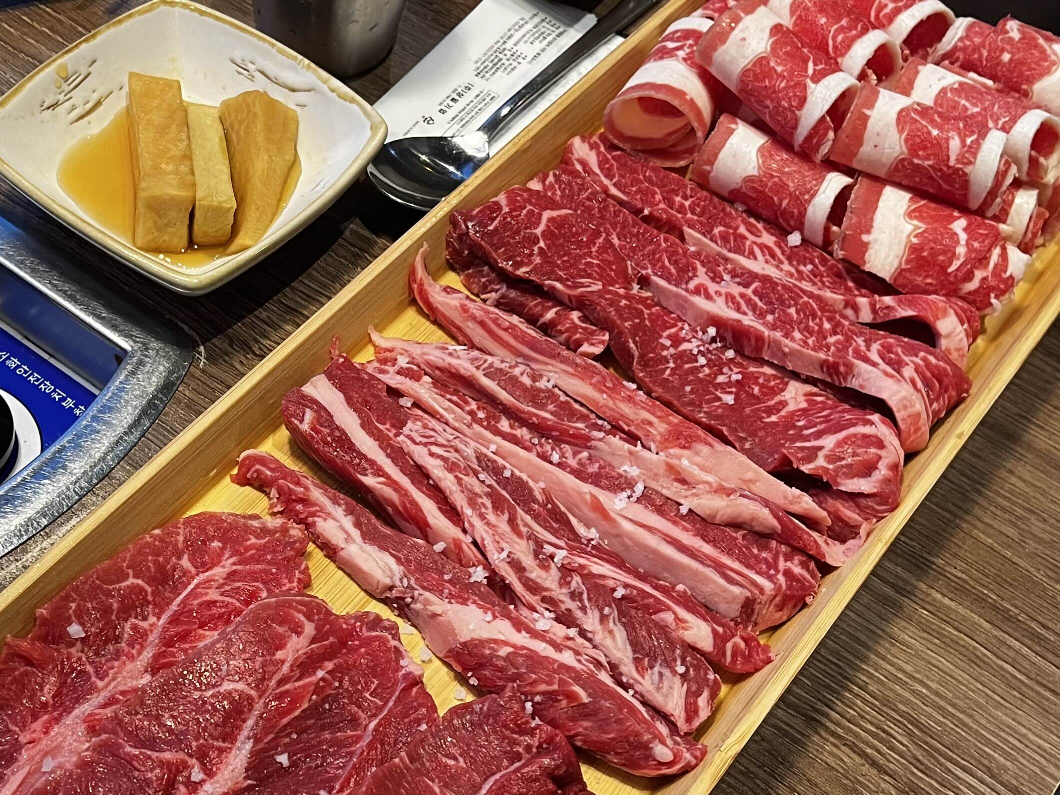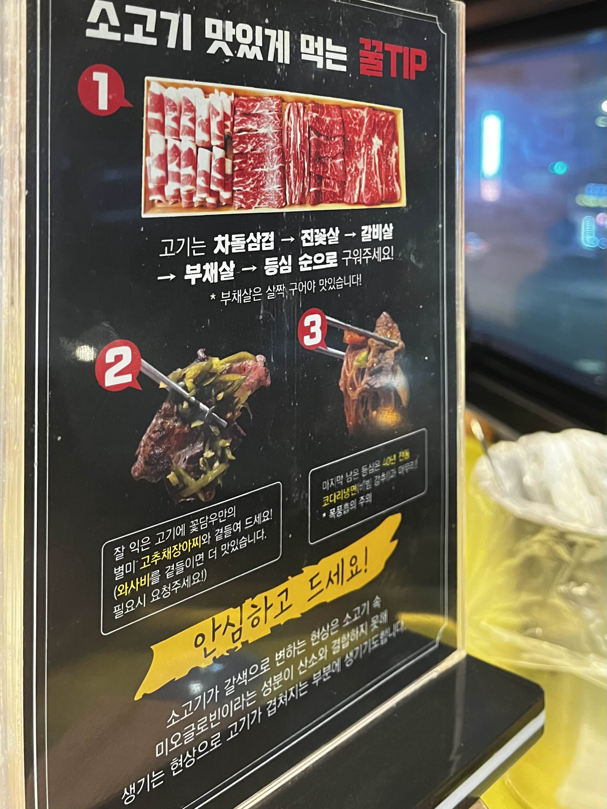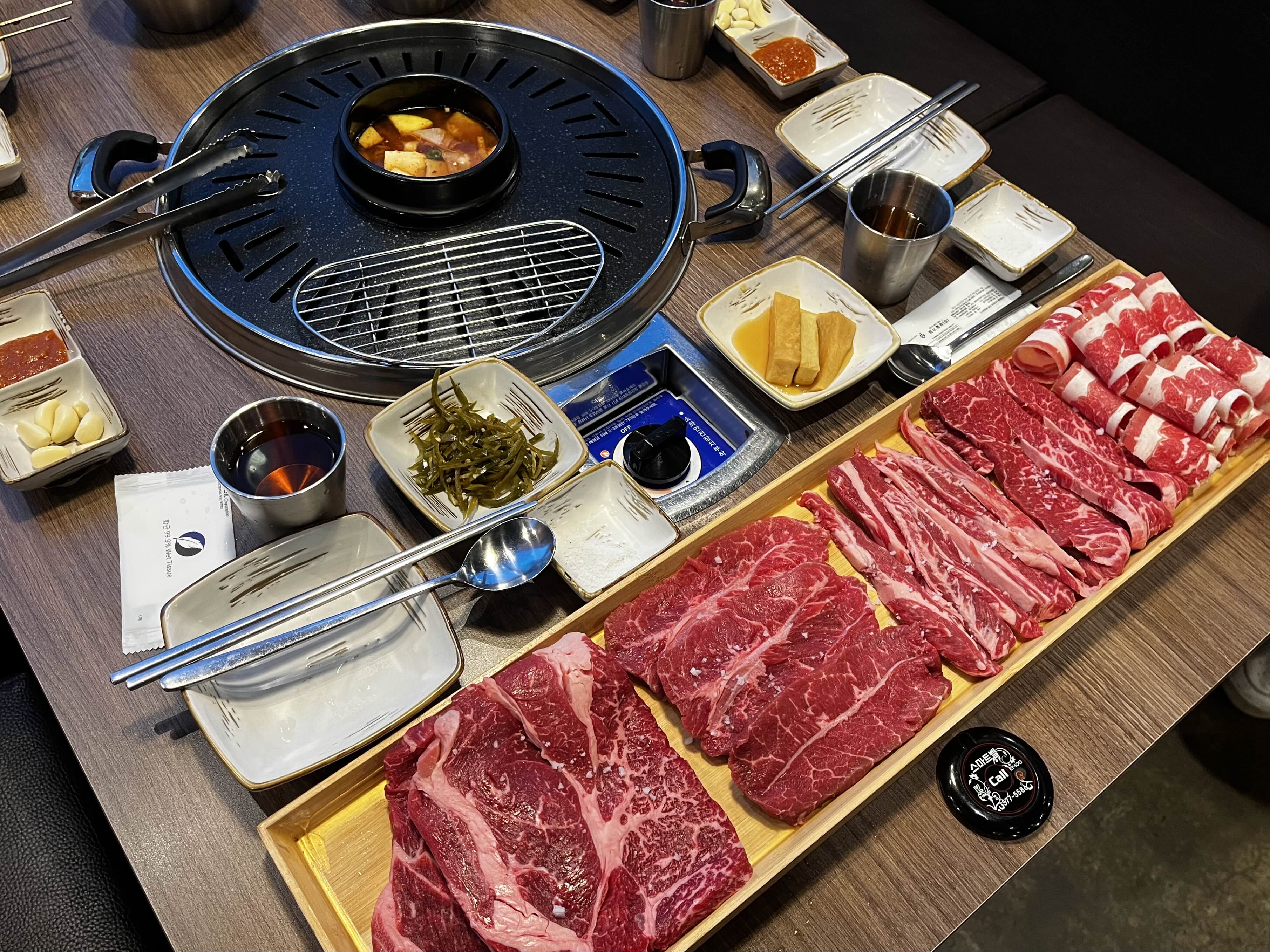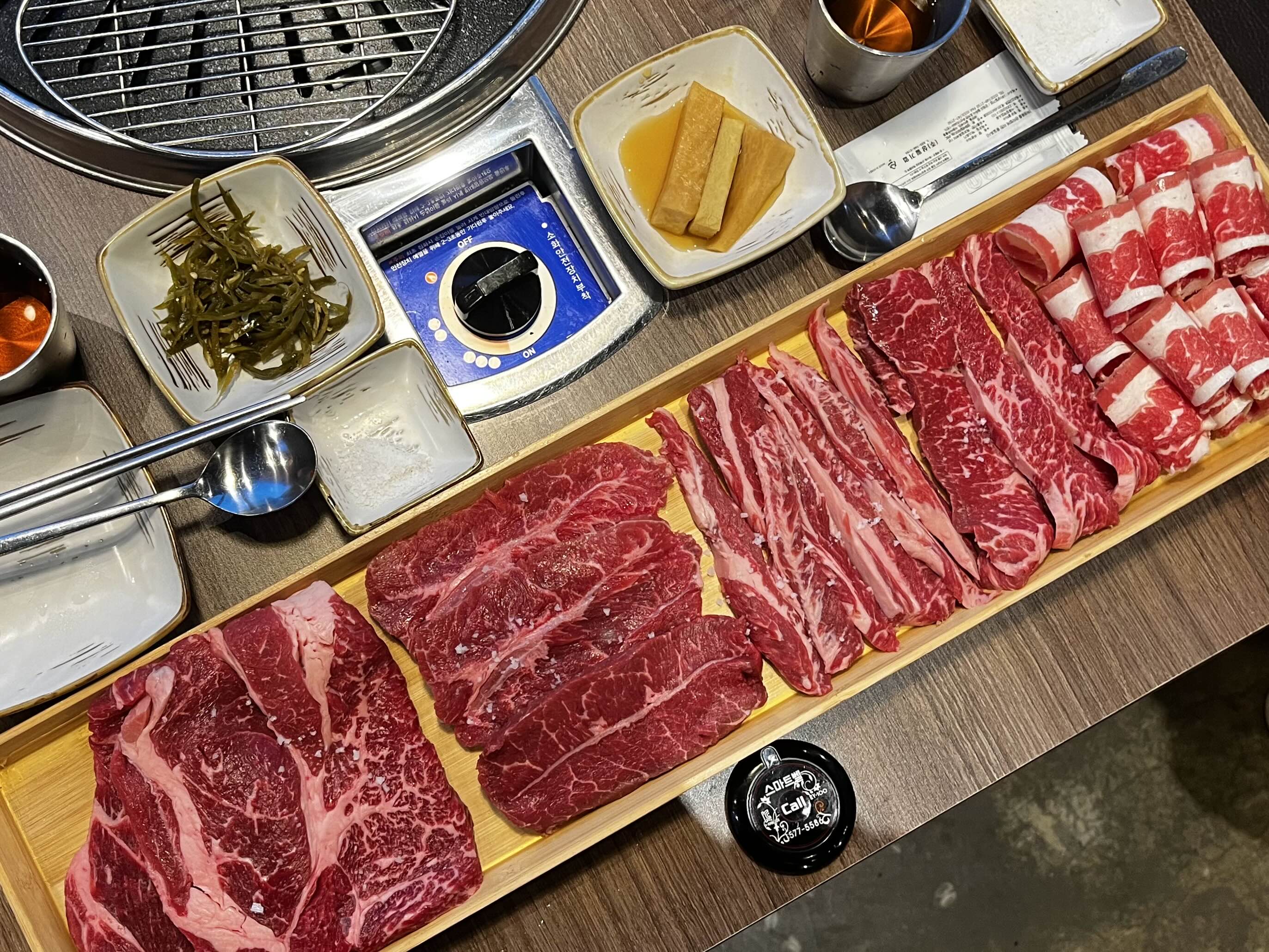 ※ 고기는 사진상 오른쪽에서 왼쪽 순서(차돌삼겹 - 진꽃살 - 갈빗살 - 부챗살 - 등심)로 구워주세요 ※