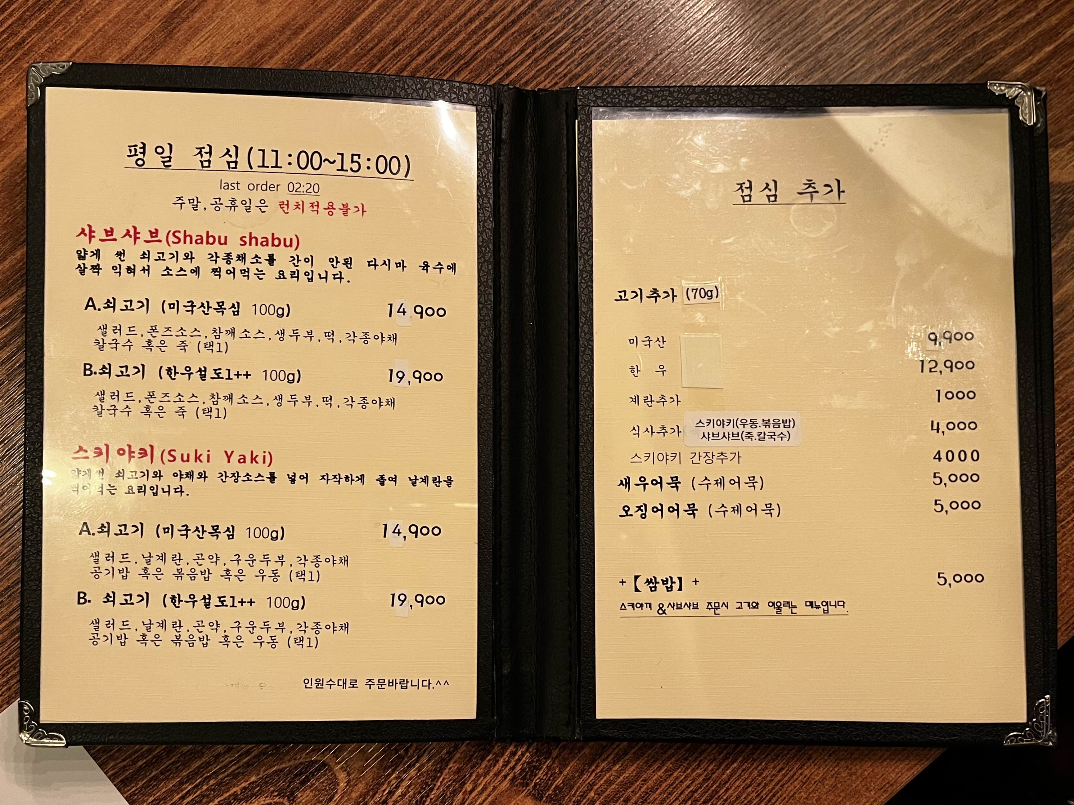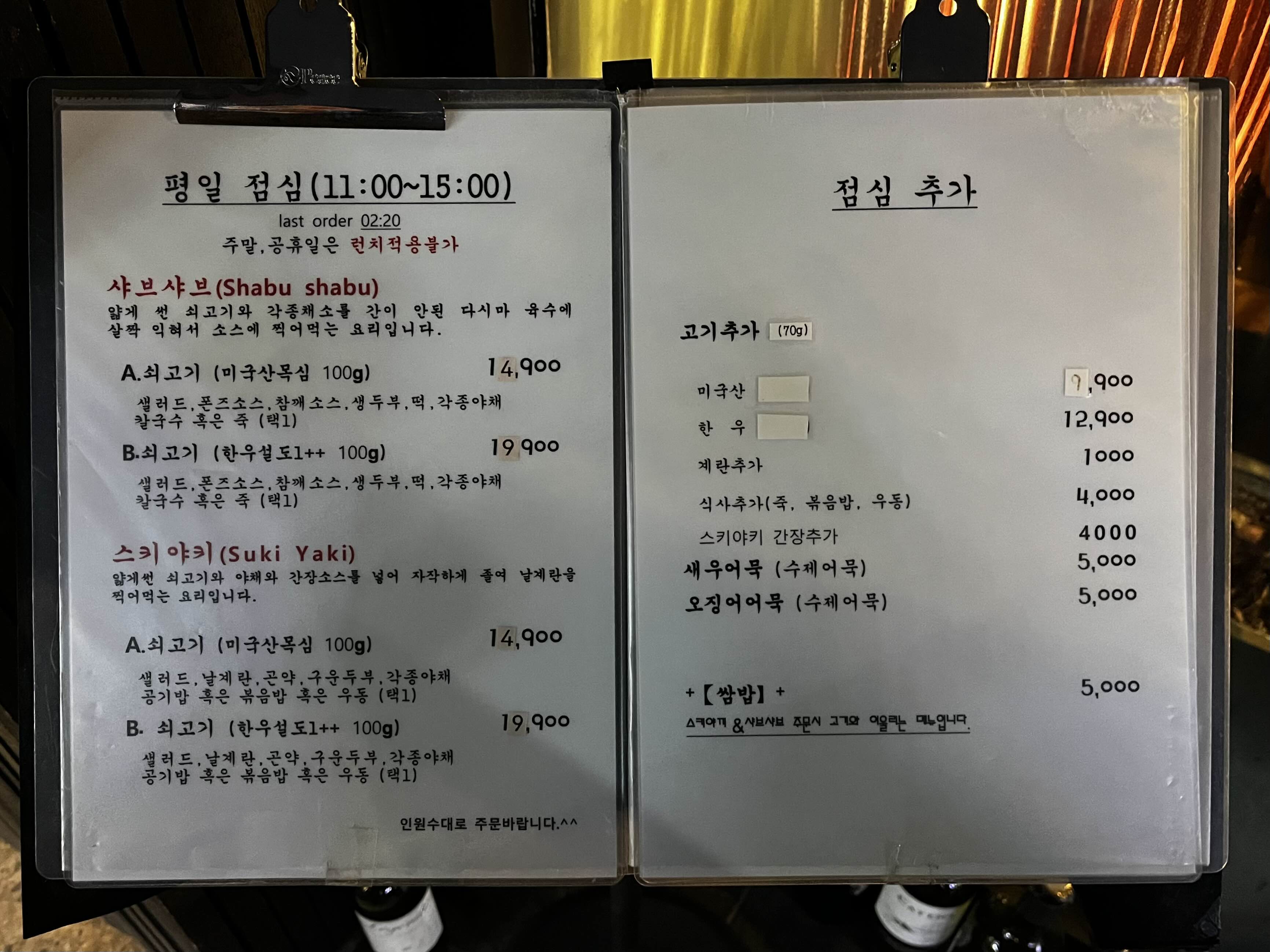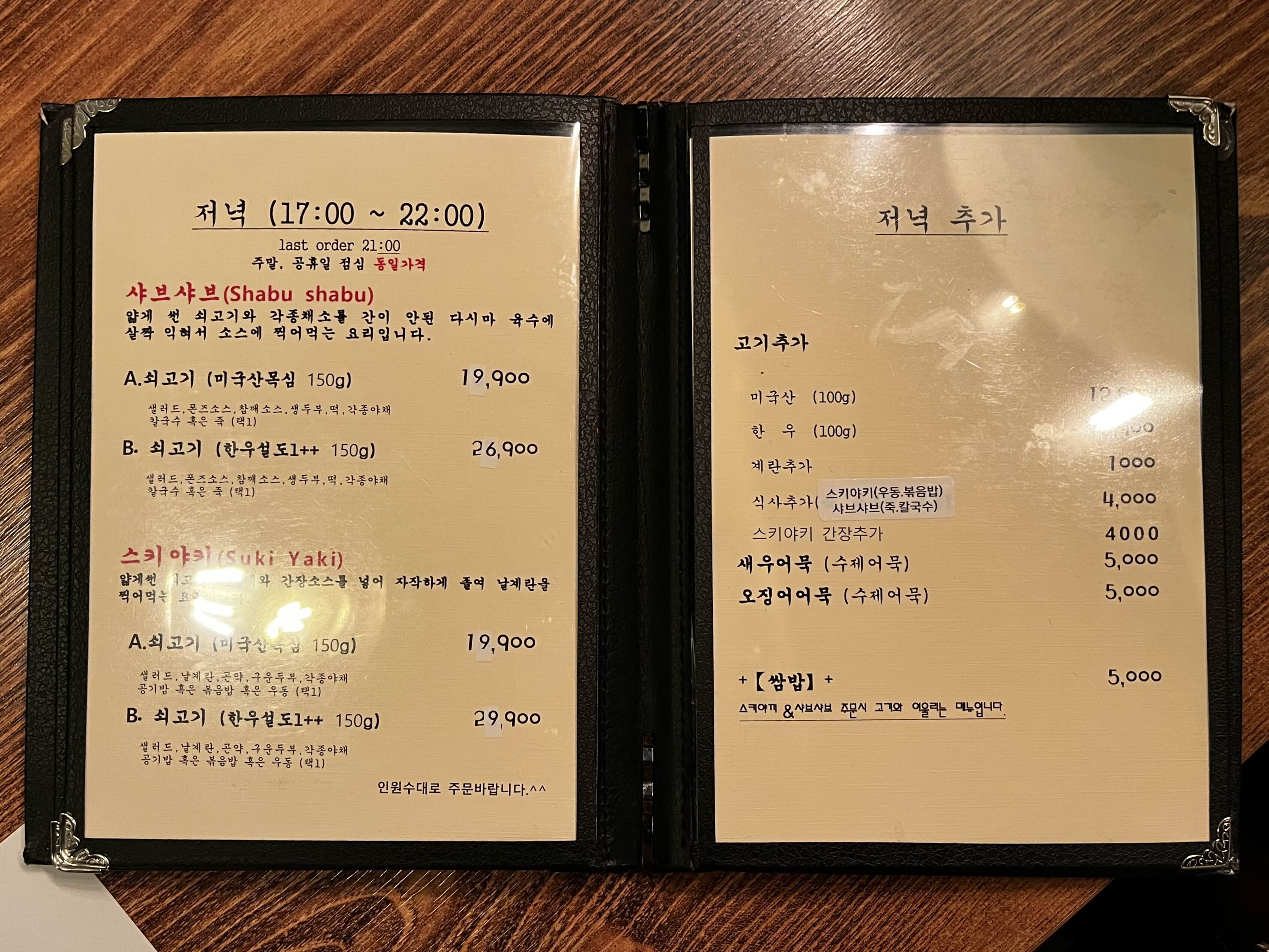 📋스키야키 A. 쇠고기(미국산 목심 150g) 19,900원 *2人