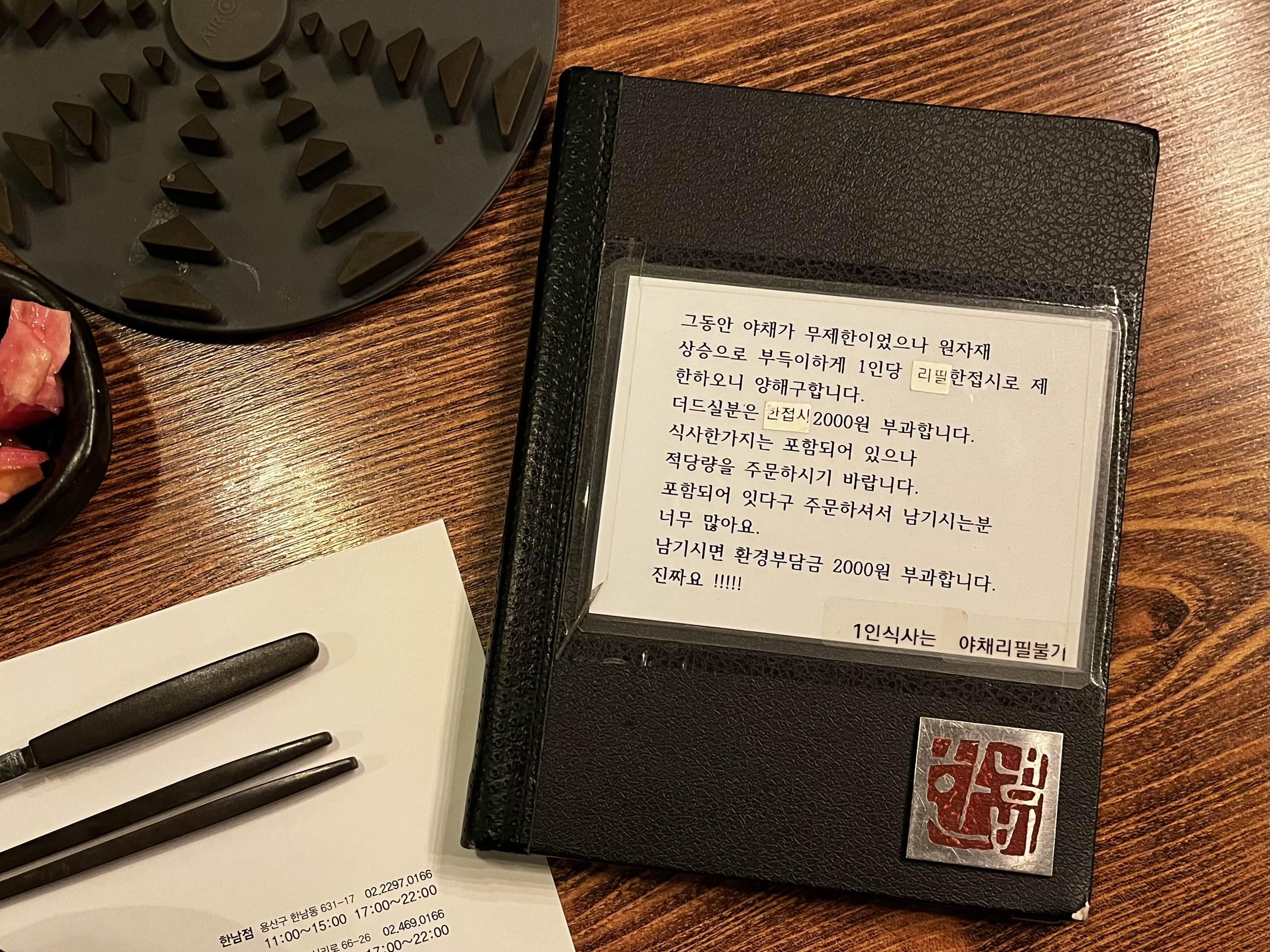 원래 채소가 무한리필로 제공되는 곳이었는데, 지금은 물가상승으로 1인당 리필 한 번만 가능하다고 합니다