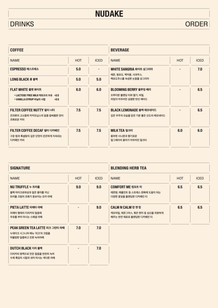 누데이크에서 판매 중인 전체 음료 메뉴예요