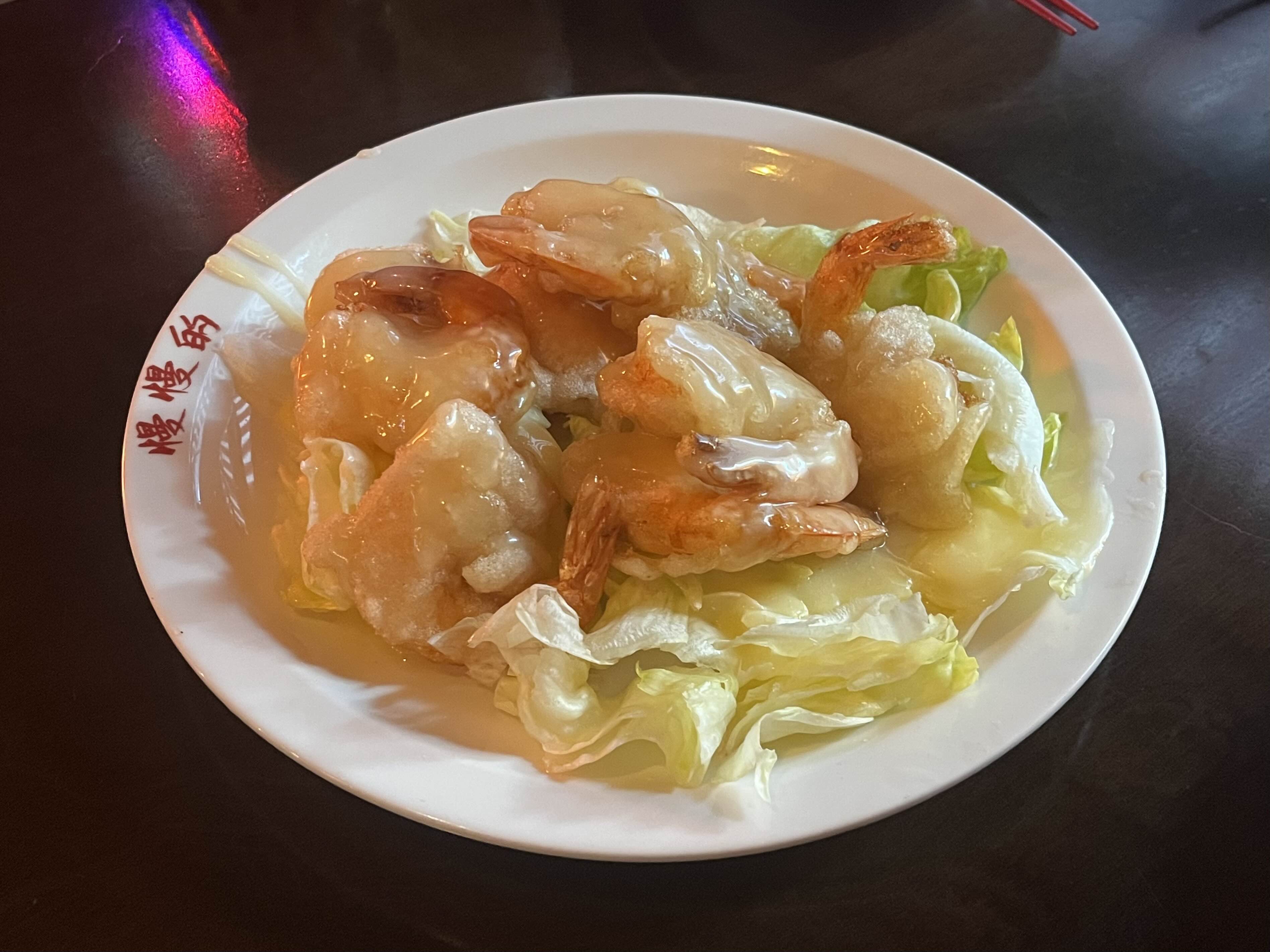 양파와 꿀을 넣어 직접 만든 소스를 얹은 바삭한 새우 요리라고 해요🦐