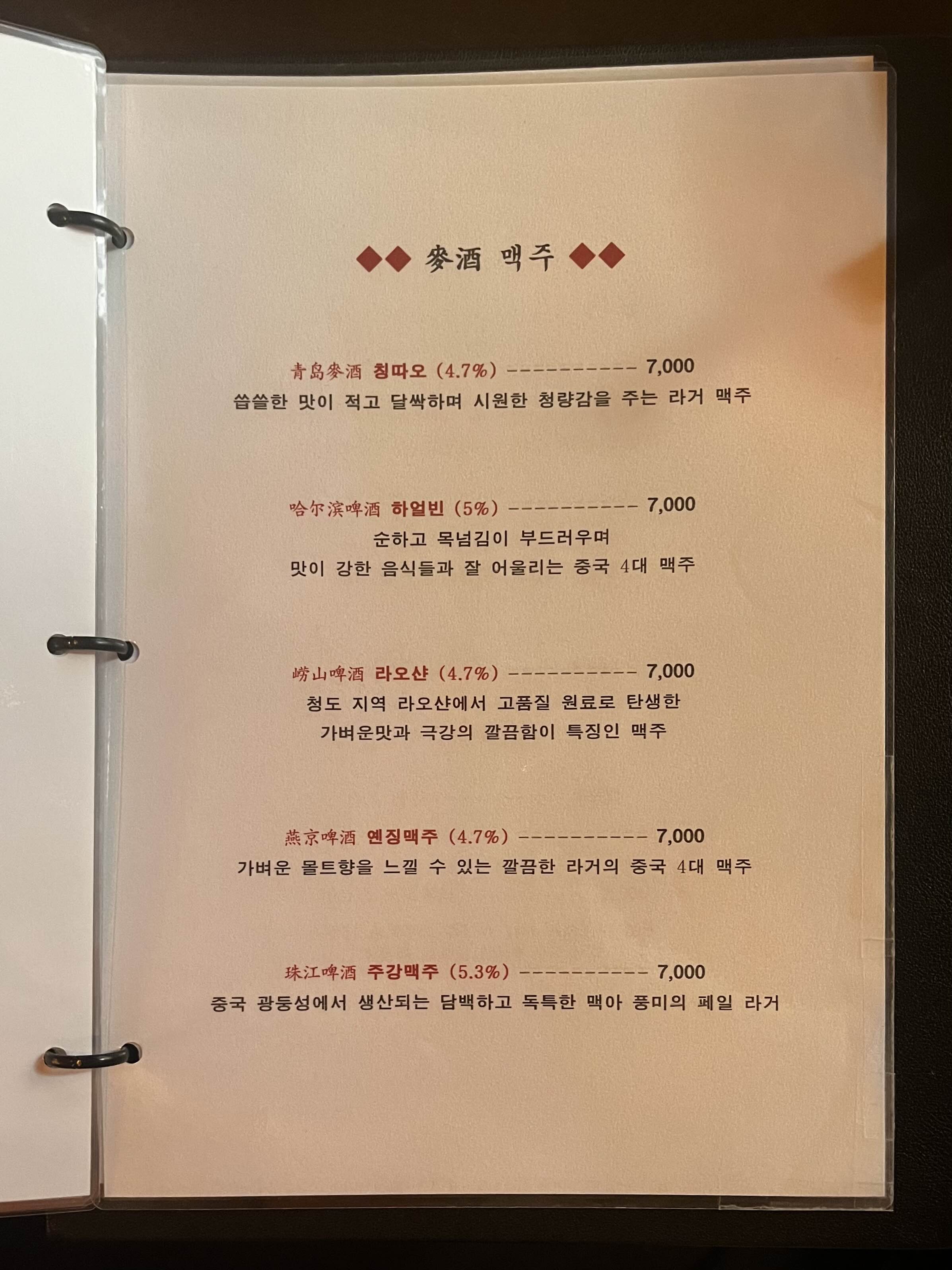 설원백주 / 북경소주 / 혁명소주 / 빙홍차 / 칭따오 / 양하 하이볼 등