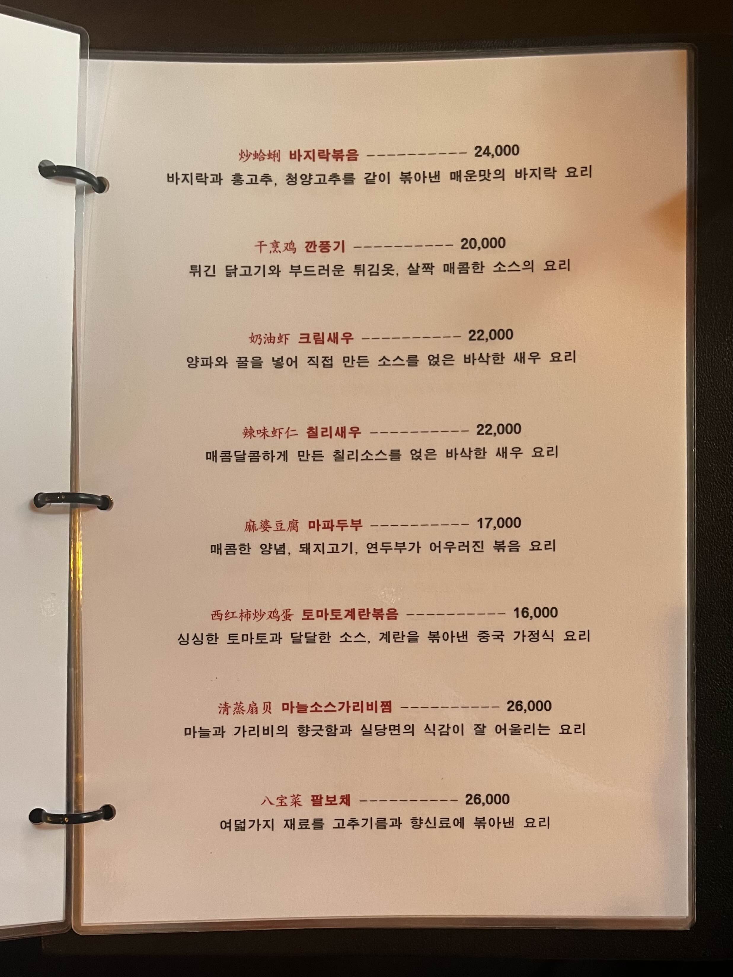 탕 메뉴 외에도 양갈비 / 라조기 / 라즈지 / 향라대하 / 지삼선★ / 꿔바로우 / 마라샹궈 / 어향가지 / 멘보샤 등