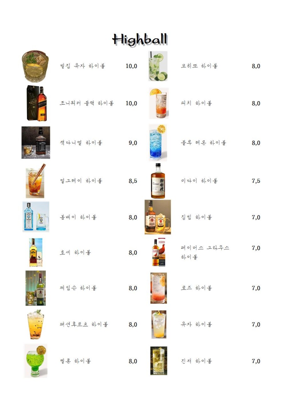 벌집 유자 하이볼 / 잭다니엘 하이볼 / 얼그레이 하이볼 / 제임슨 하이볼 / 패션후르츠 하이볼 등