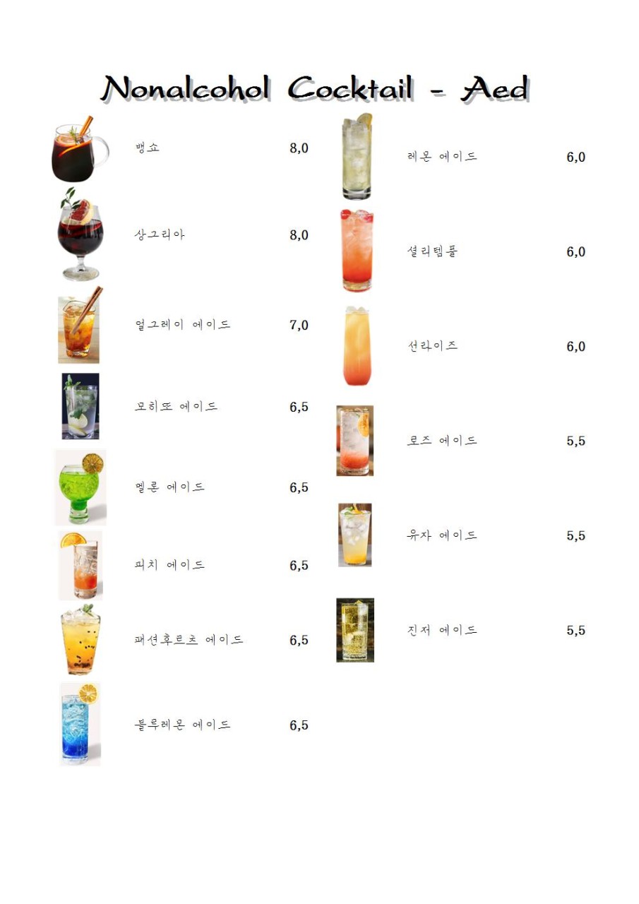 술을 안 드시는 분들을 위한 논알코올 칵테일과 에이드 종류도 준비되어 있습니다🍸🍹