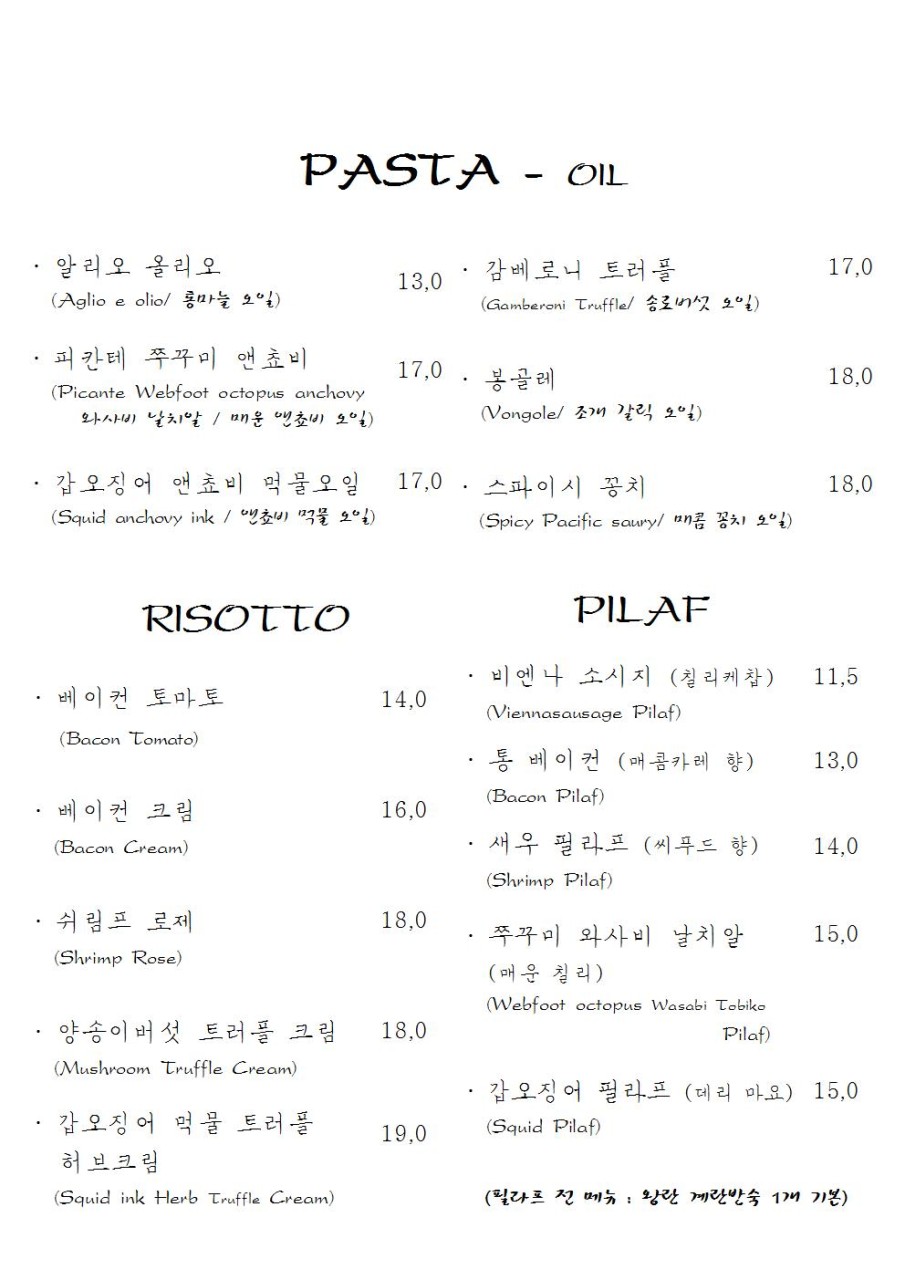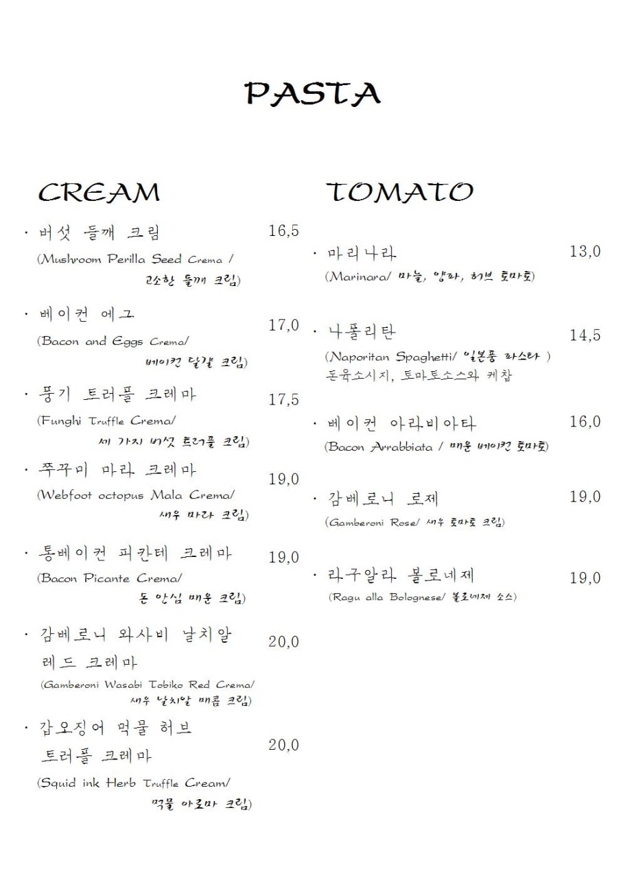 버섯 들깨 크림 / 베이컨 에그 / 나폴리탄 / 라구알라 볼로네제 / 알리오 올리오 / 갑오징어 앤쵸비 먹물오일 등