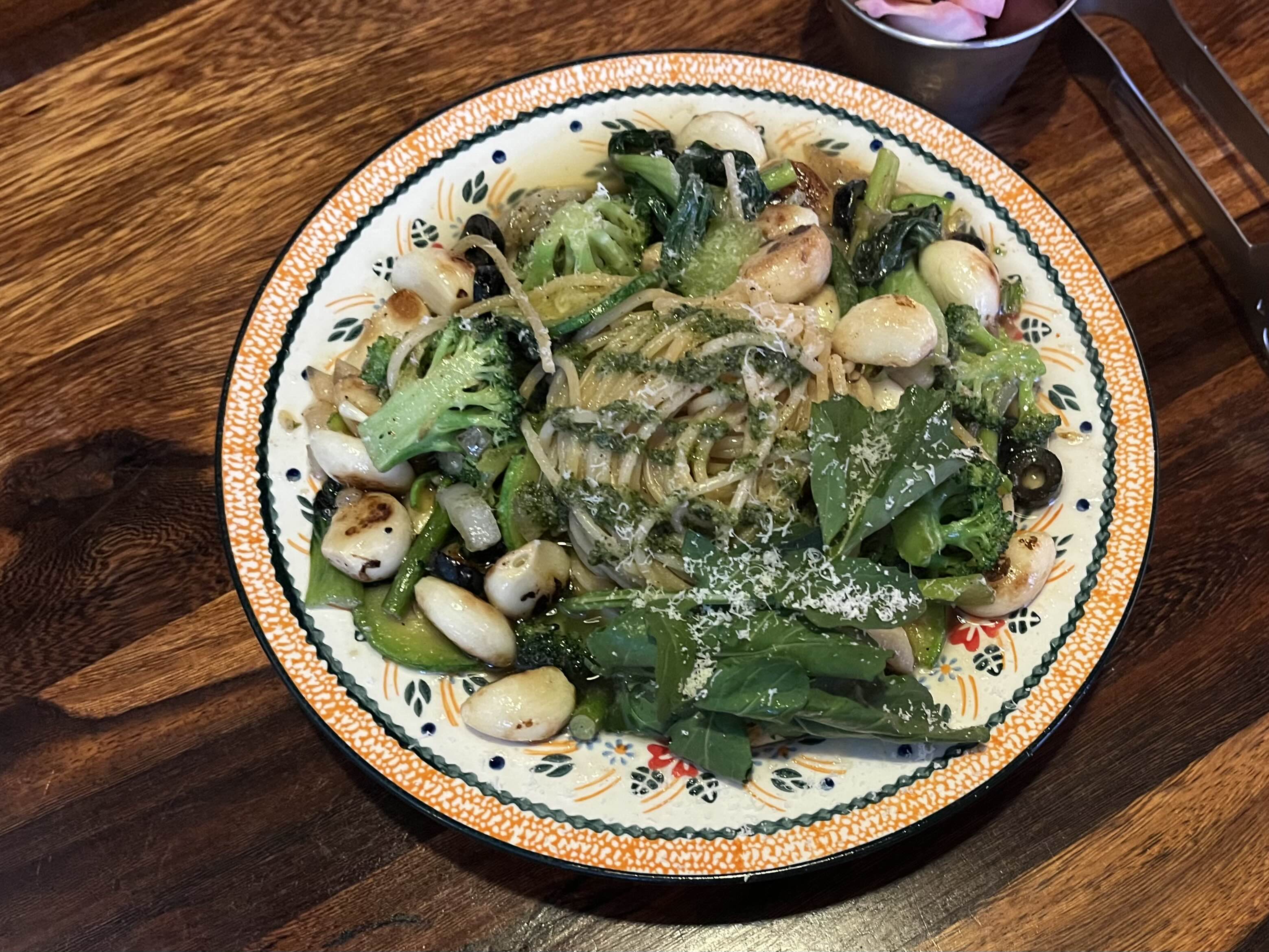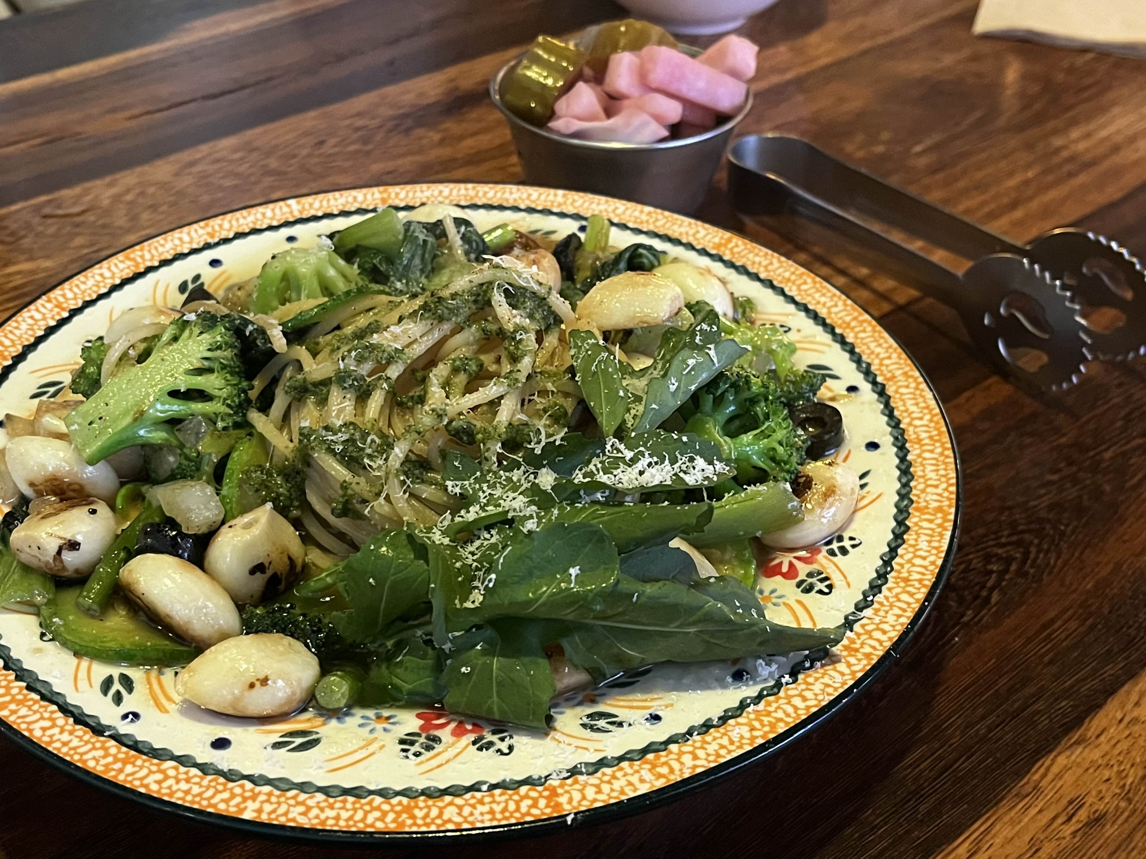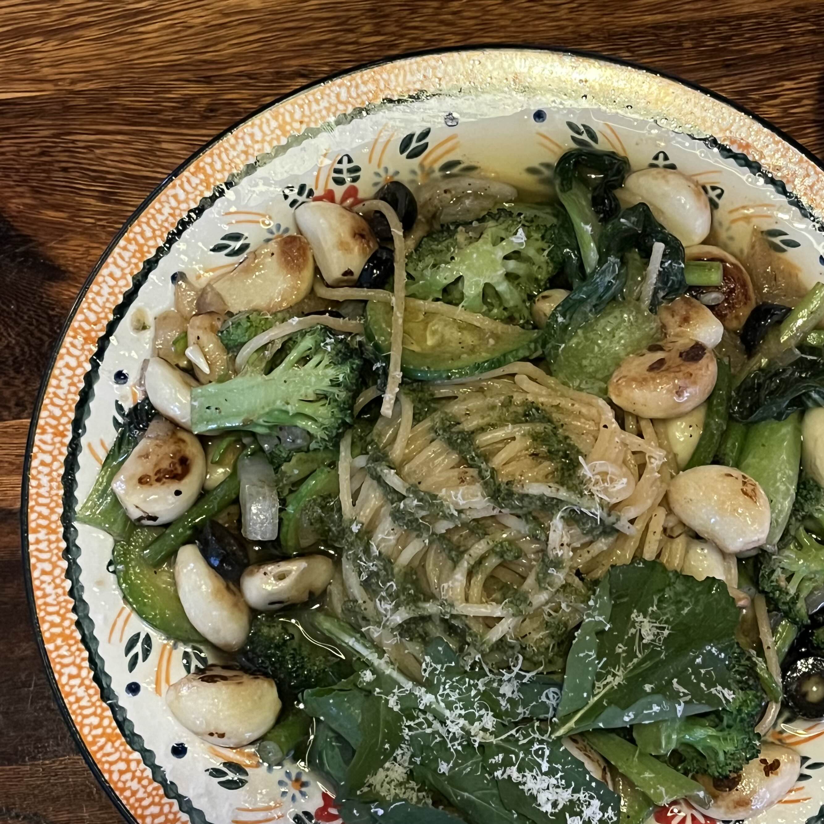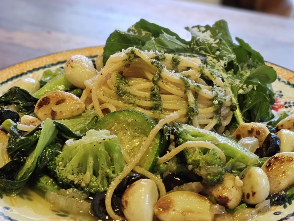 부엌숲의 알리오 올리오에는 통마늘 / 청경채 / 브로콜리 / 호박 등 다양한 초록 채소들이 듬뿍 들어갑니다🌿💚