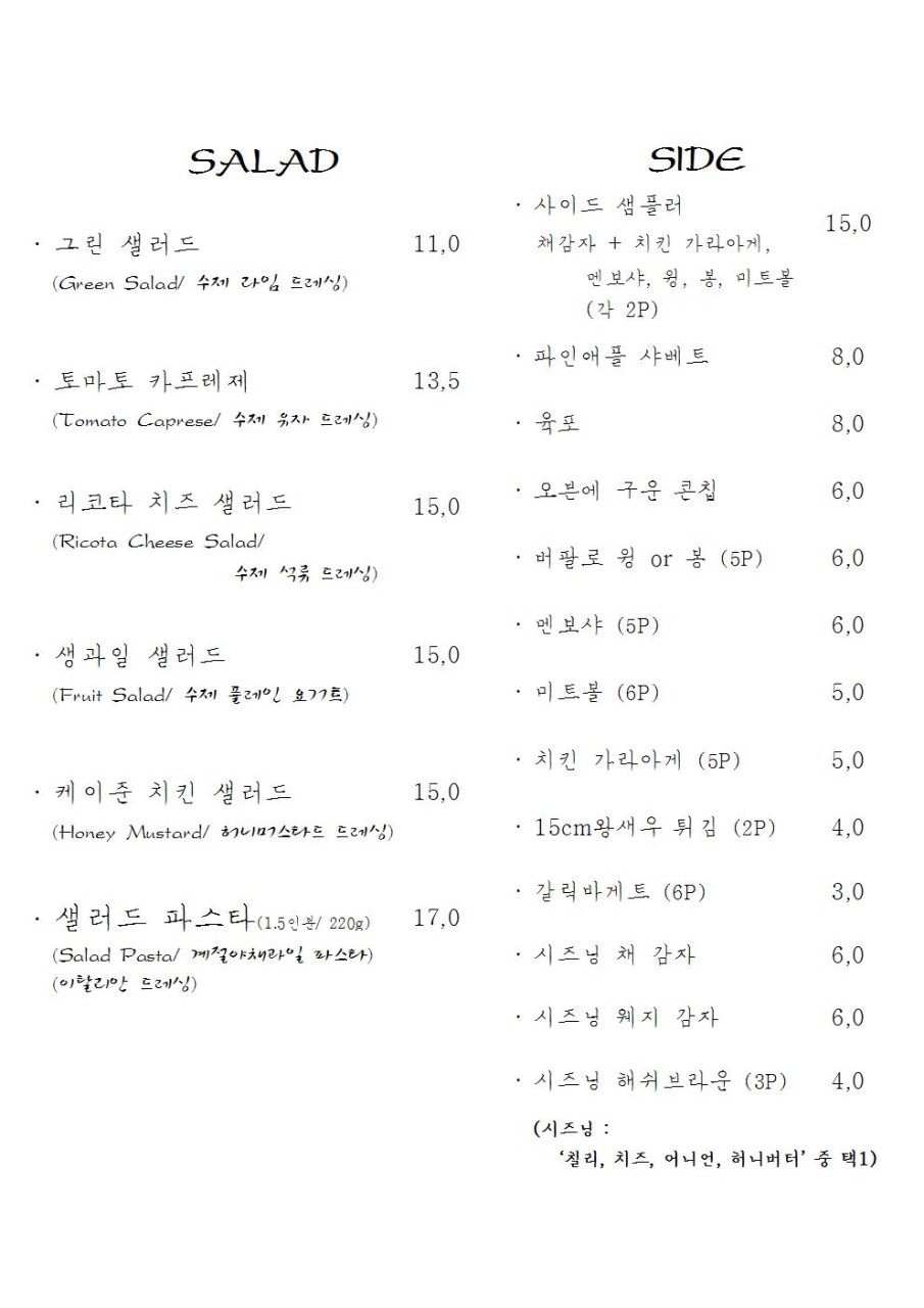 스테이크와 파스타 외 사이드로 함께 주문하기 좋은 메뉴와 기타 메뉴들입니다