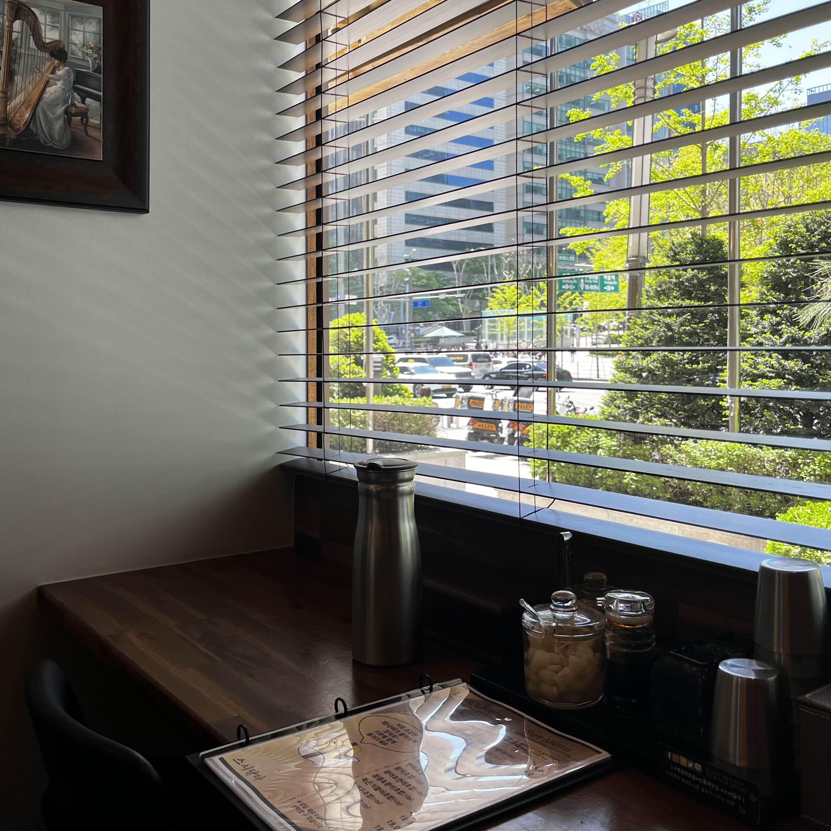 따뜻한 햇살도 블라인드 사이로 듬뿍 들어오고, 복작복작한 홀을 등지고 앉는 자리라 만족도 최상🥰