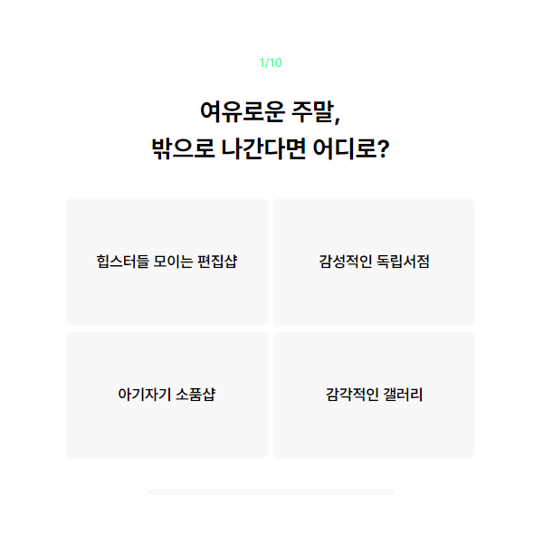 간단한 질문항목이지만 평소 저의 생각과 스타일, 감각을 일깨워주는 듯한 느낌이 들더라고요🤔