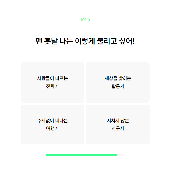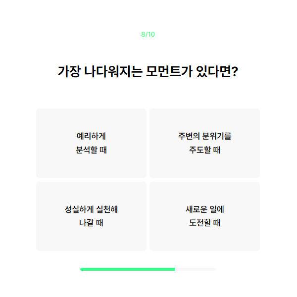 총 10개의 질문으로 이루어져 있고, 16가지 중 어떤 타입에 해당하는지 개개인의 아우라를 분석해 준다고 합니다