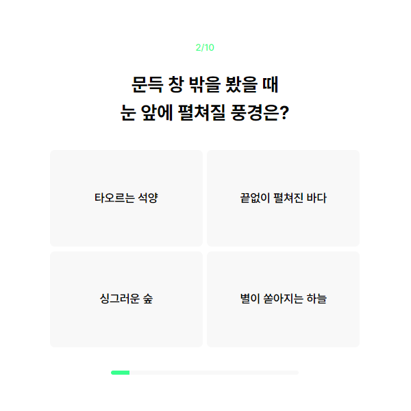 간단한 질문으로 각자의 취향과 감각, 성향을 생각해 볼 수 있는 테스트였어요