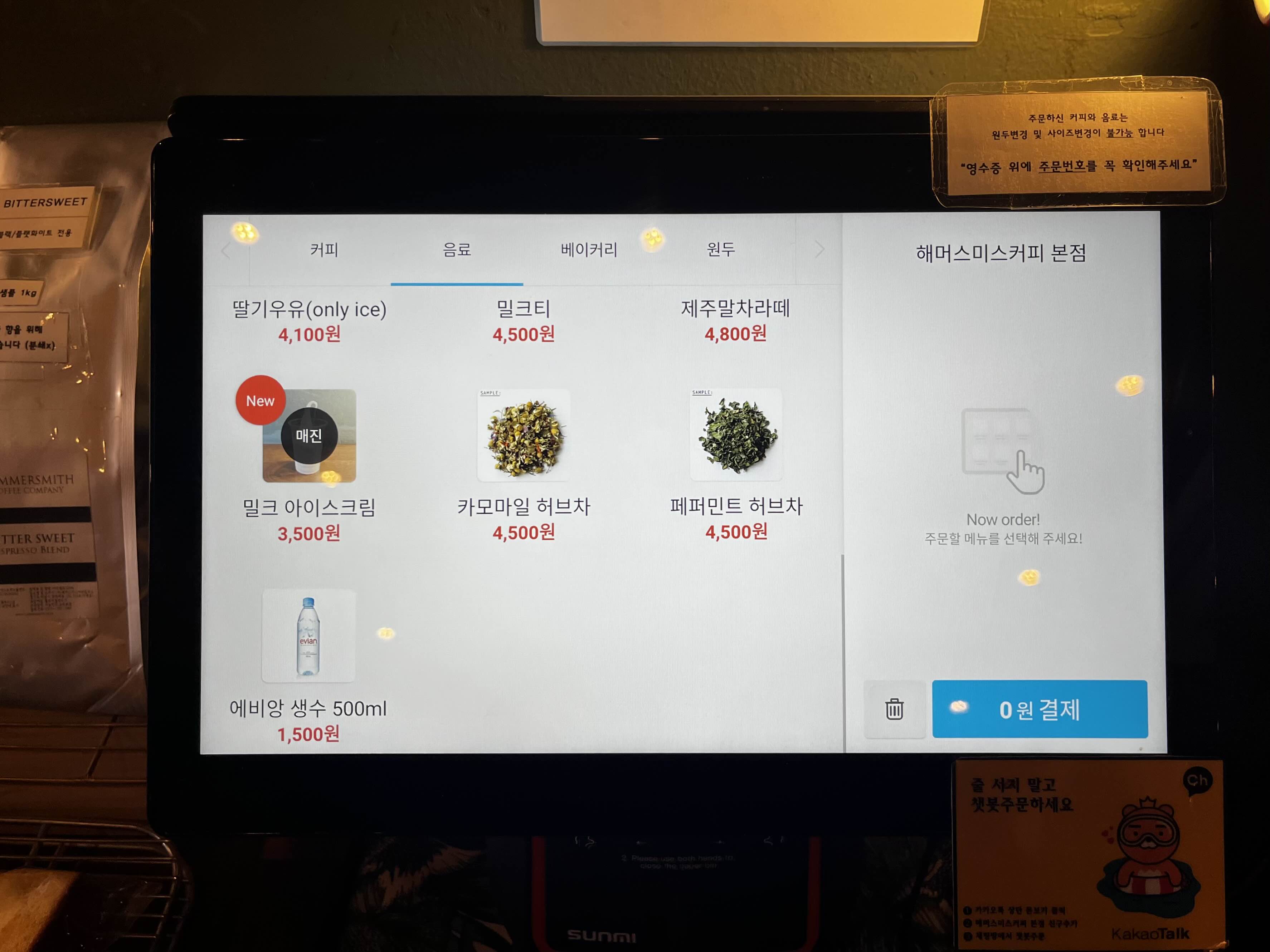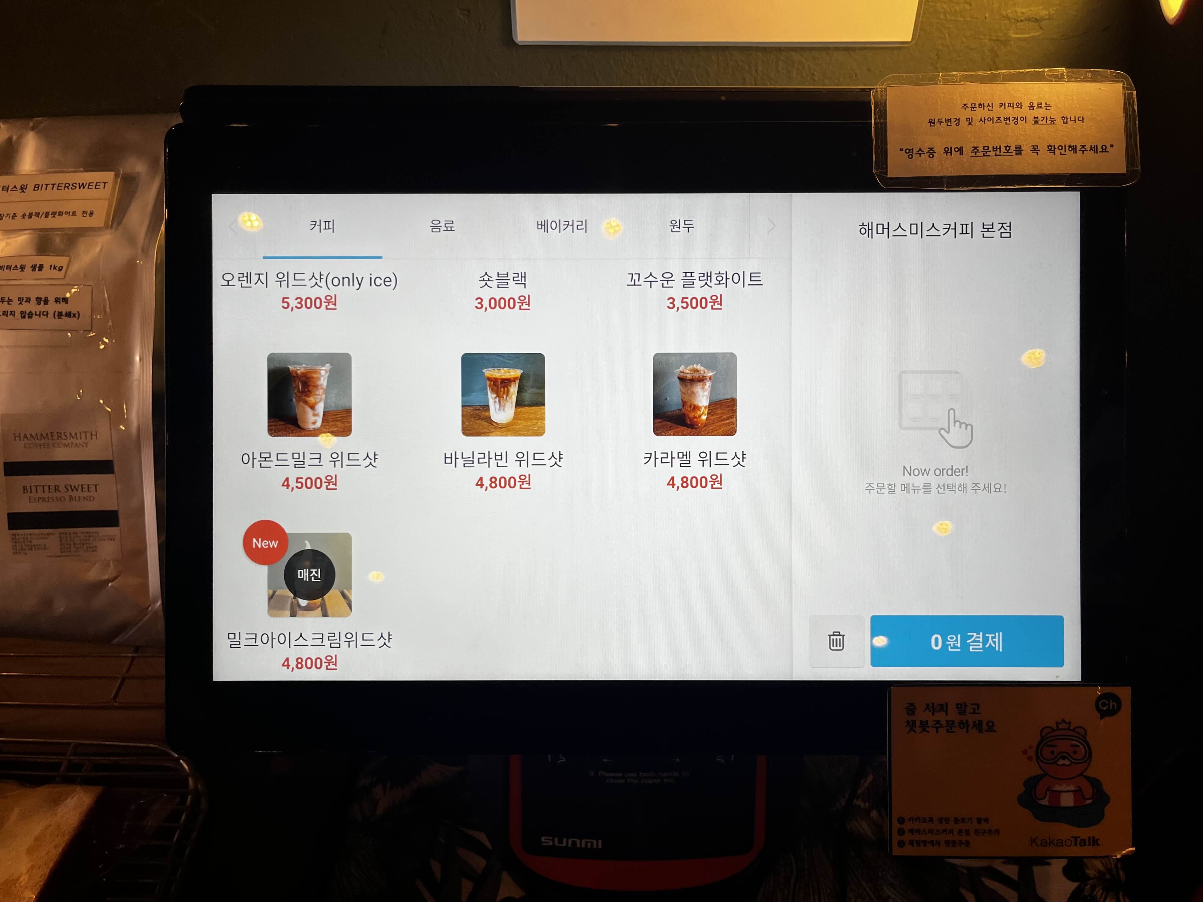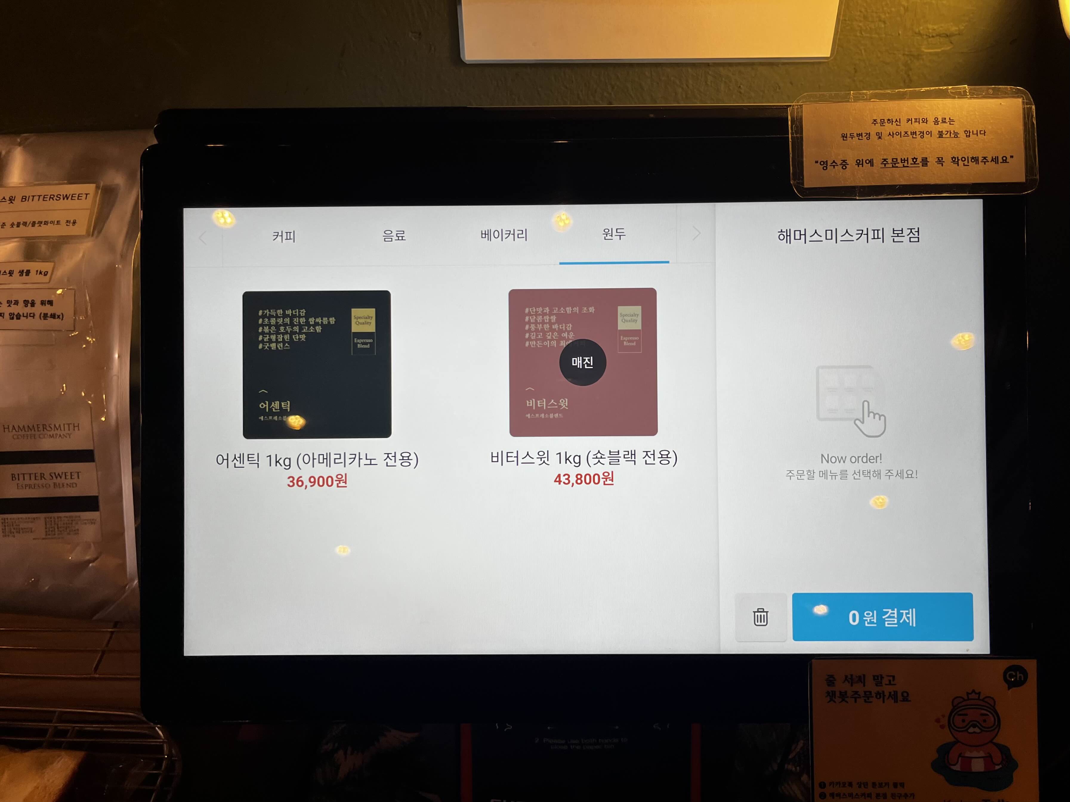 간단한 디저트 종류와 해머스미스에서 사용하는 원두 또한 키오스크에서 주문 가능해요