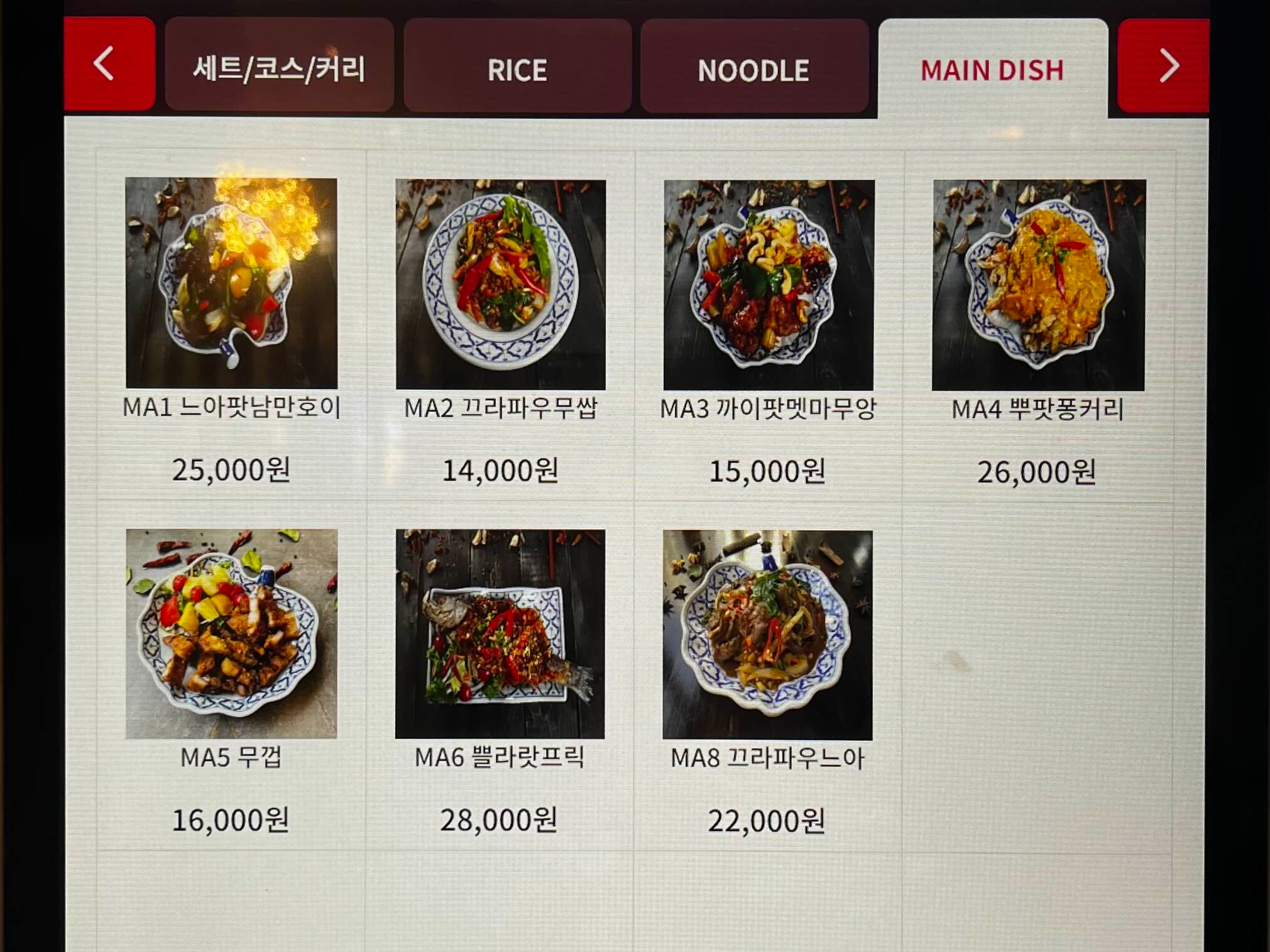 자리마다 있는 메뉴판에서 각 메뉴 확인 후 키오스크로 주문하셔도 됩니다