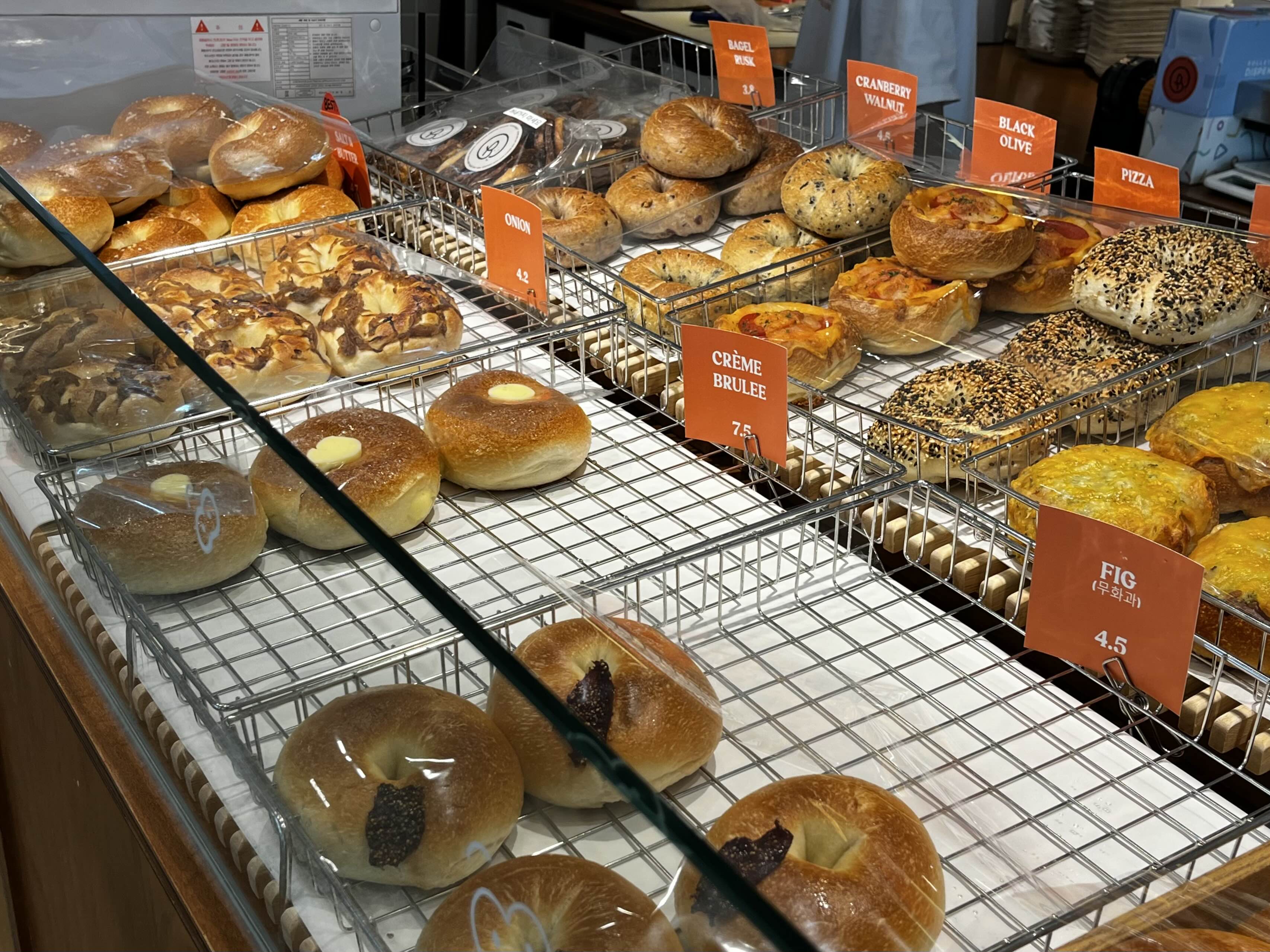 줄 맞춰서 진열된 따끈따끈 베이글과 크림치즈 종류들, 디저트까지 실물로 보실 수 있습니다🥯🥪