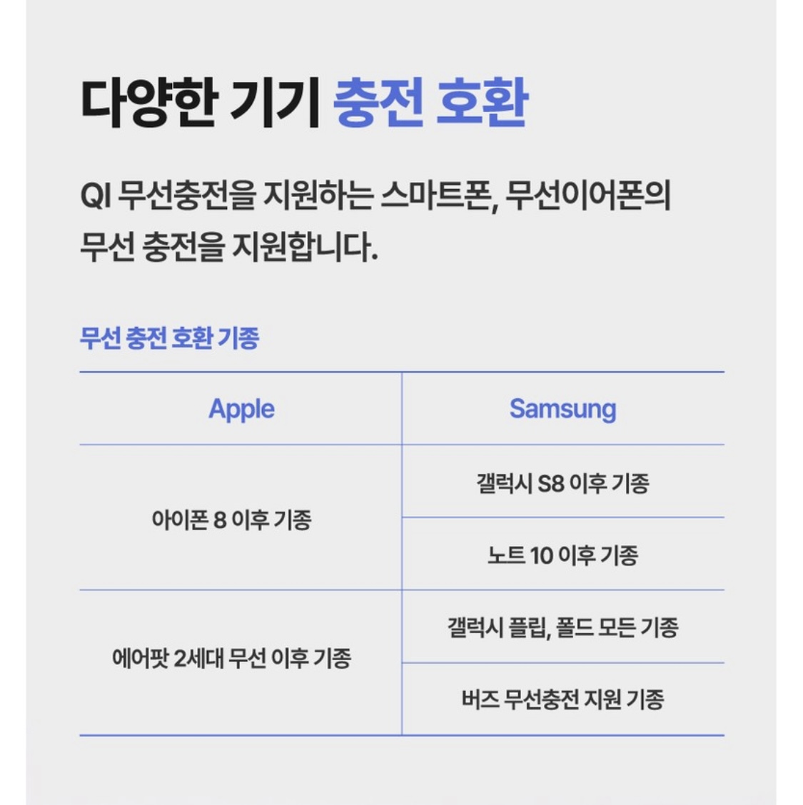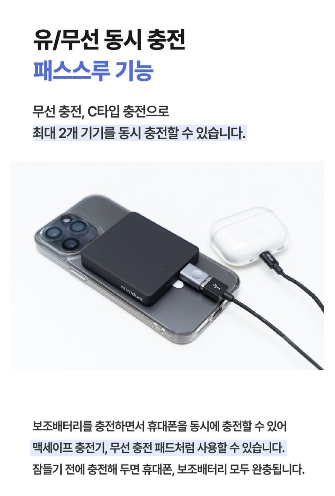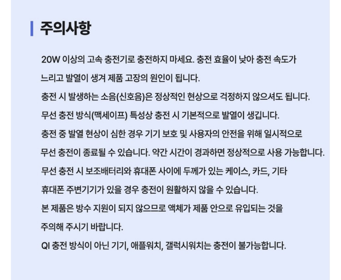 유/무선 동시 충전하는 패스스루 기능이 있어 보조배터리를 충전하면서 휴대폰도 함께 충전 가능👍