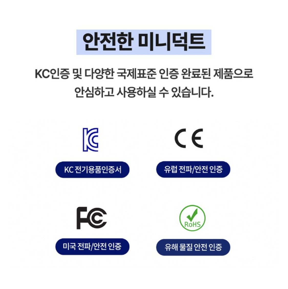 미니덕트 제품은 여러 안전 관련 국제표준 인증을 받은 제품이라고 해요