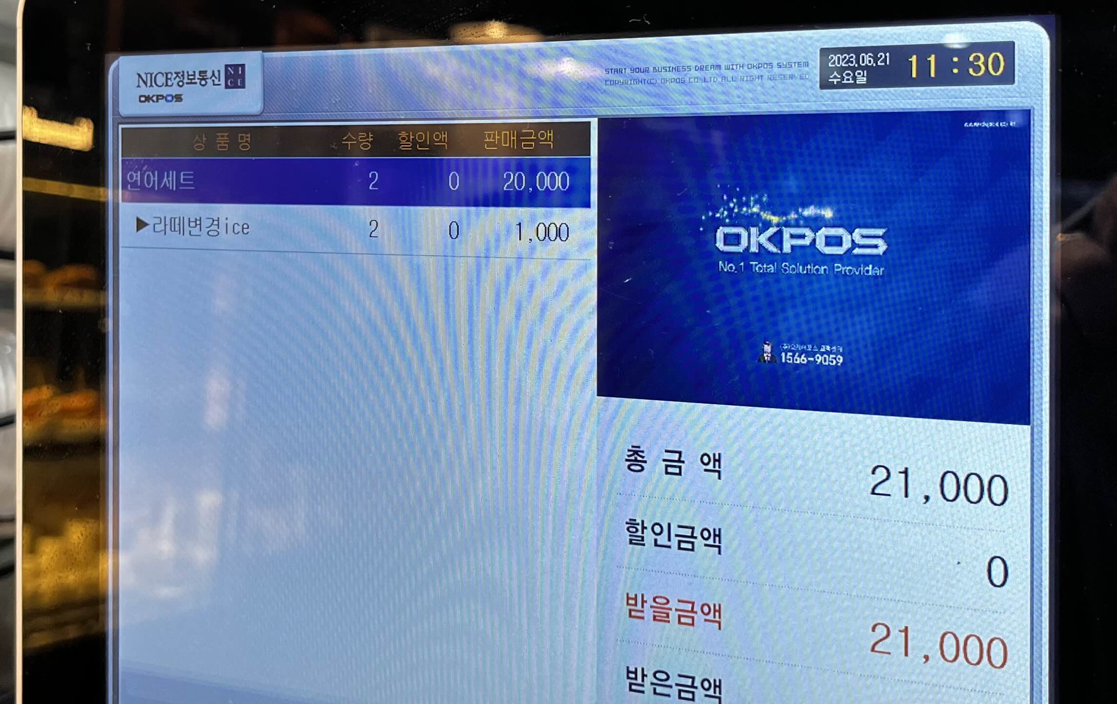 샌드위치는 연어를 선택, 커피는 아이스 라테로 변경해서 500원 추가된 금액입니다