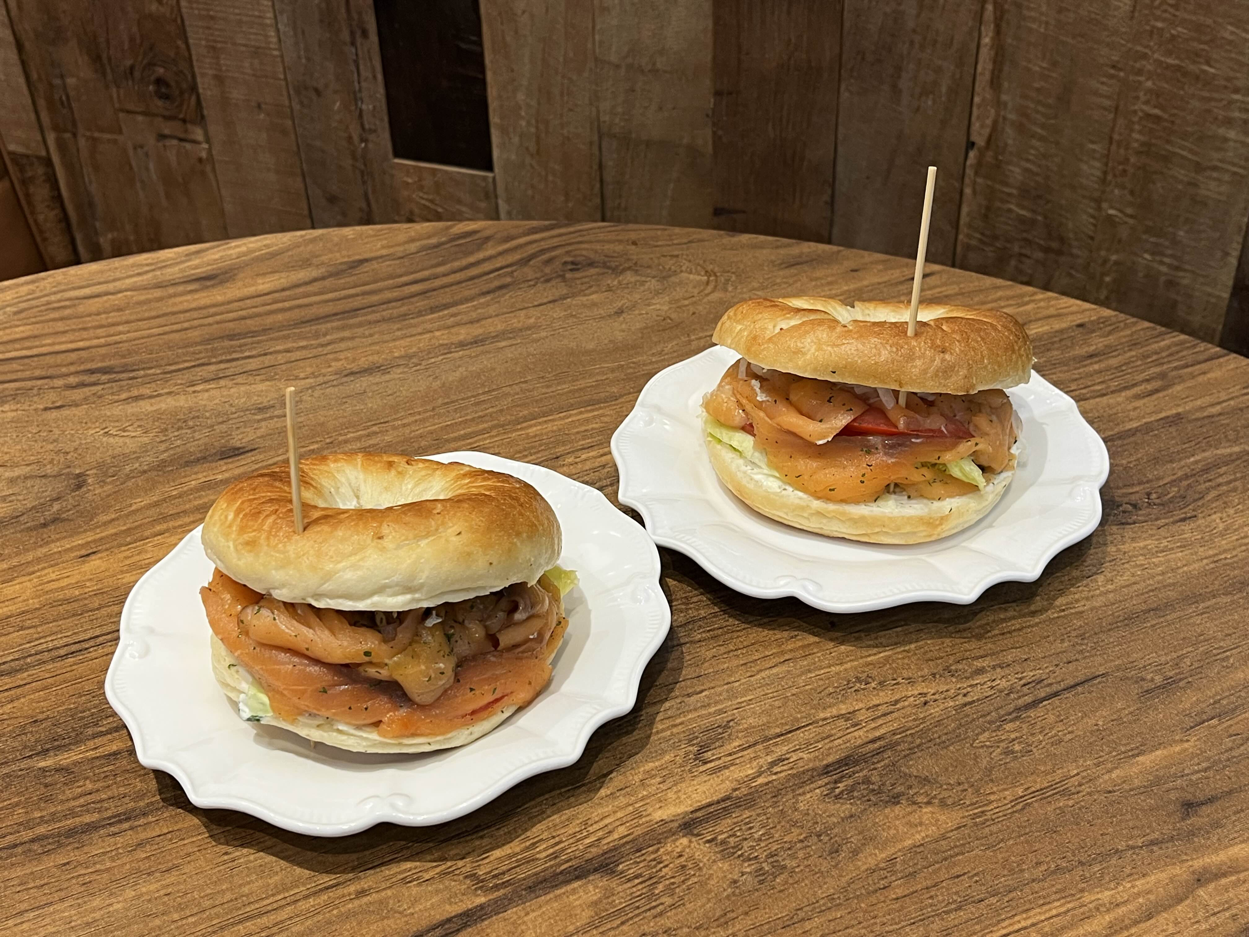 기본 베이글엔 크림치즈가 듬뿍 발려져 있고, 신선한 연어와 양배추가 가득한 스타일이에요🥪
