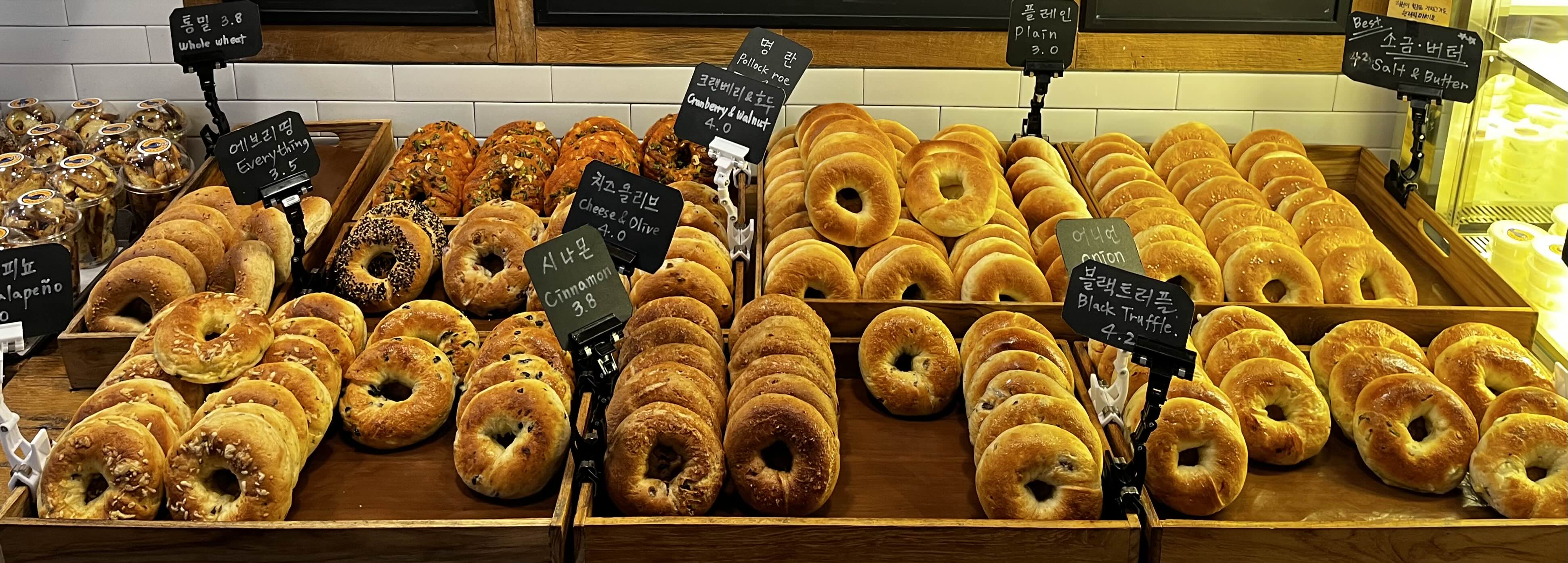 기본 베이글 종류로는 플레인 / 통밀 / 에브리띵 / 소금 & 버터 / 블랙트러플 / 쪽파 등