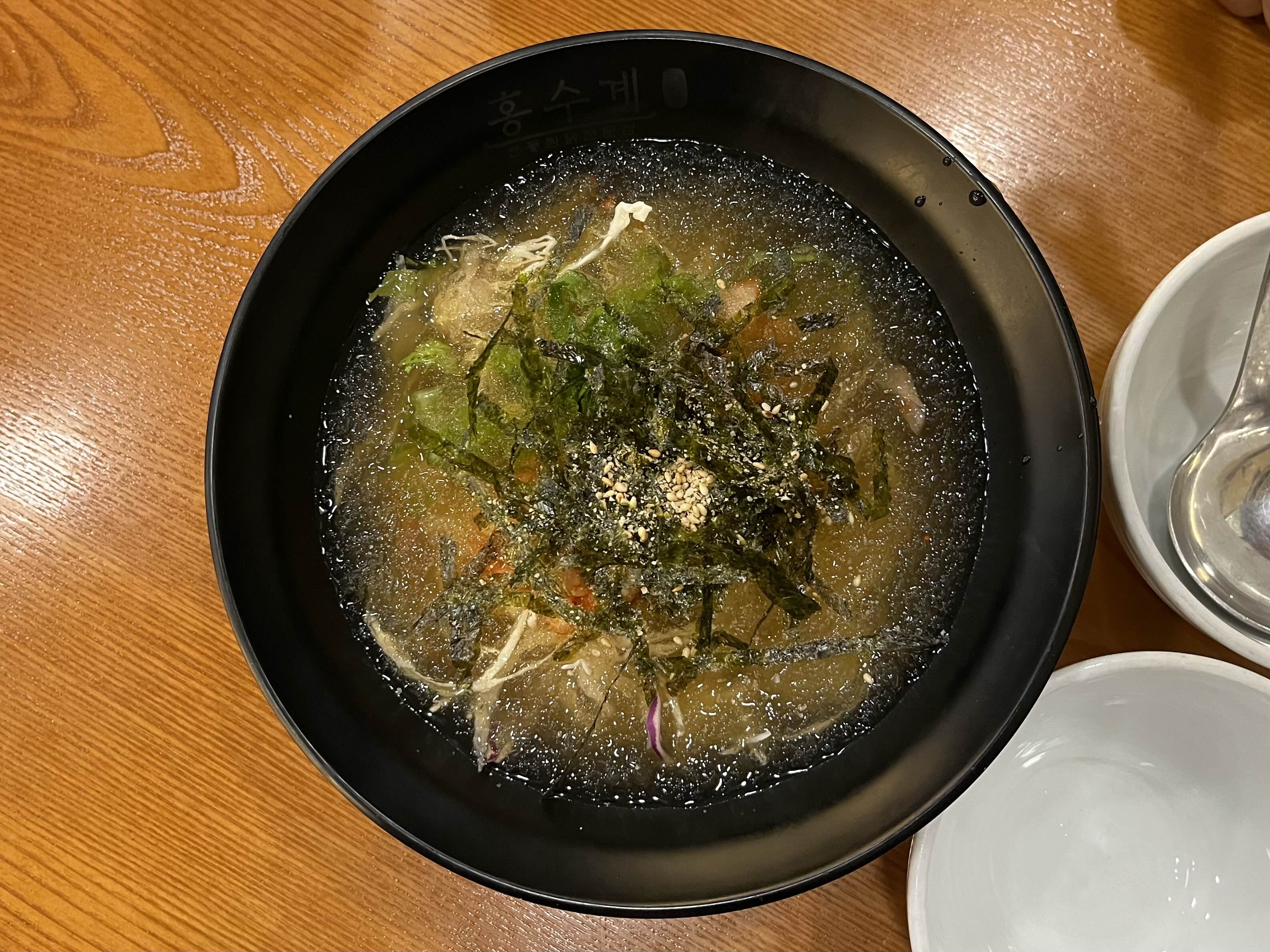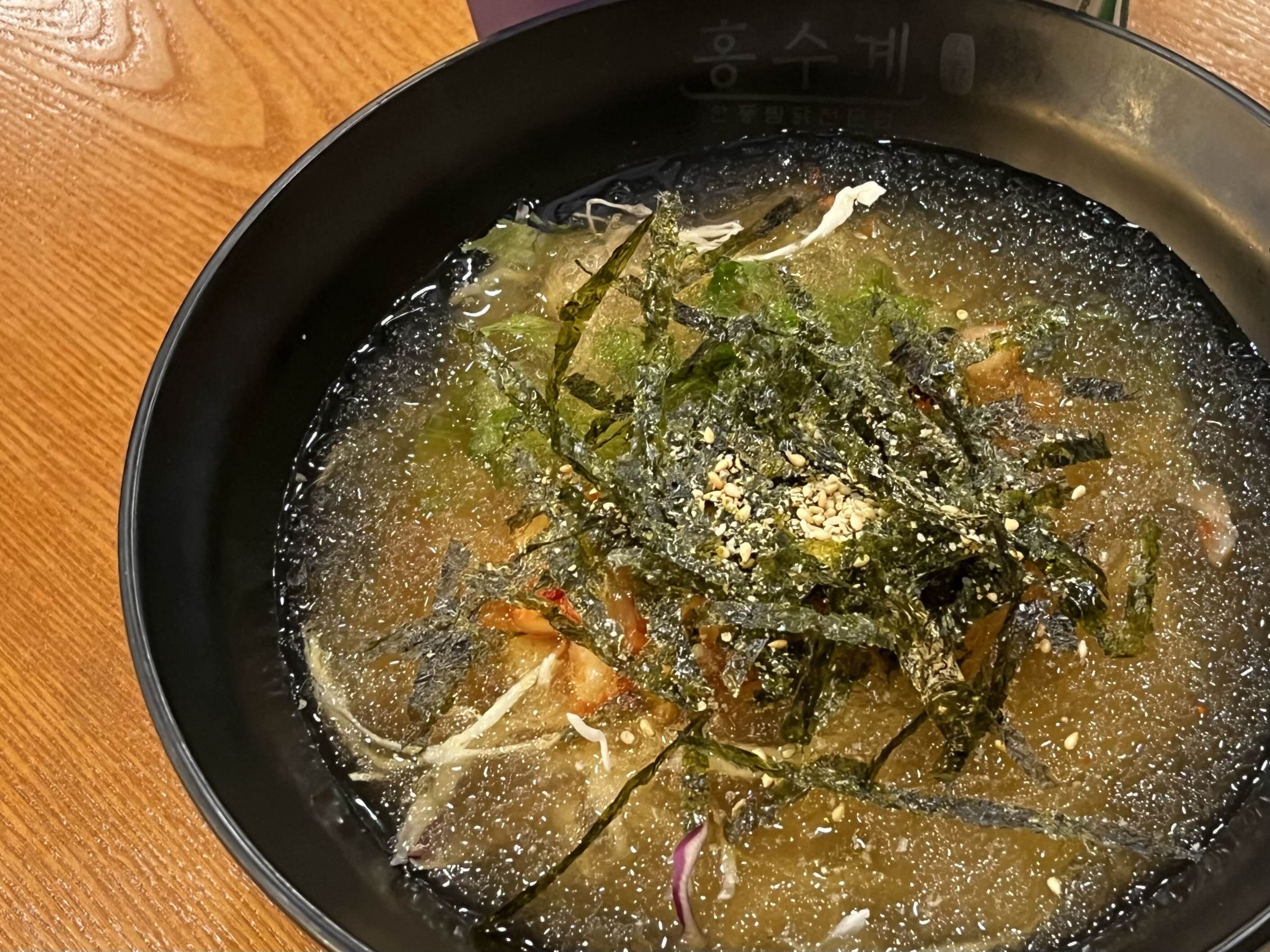 예상했던 대로 달달하고 시원한 냉면육수 + 꼬수운 묵 조합의 완벽한 애피타이저였어요🧊❄️